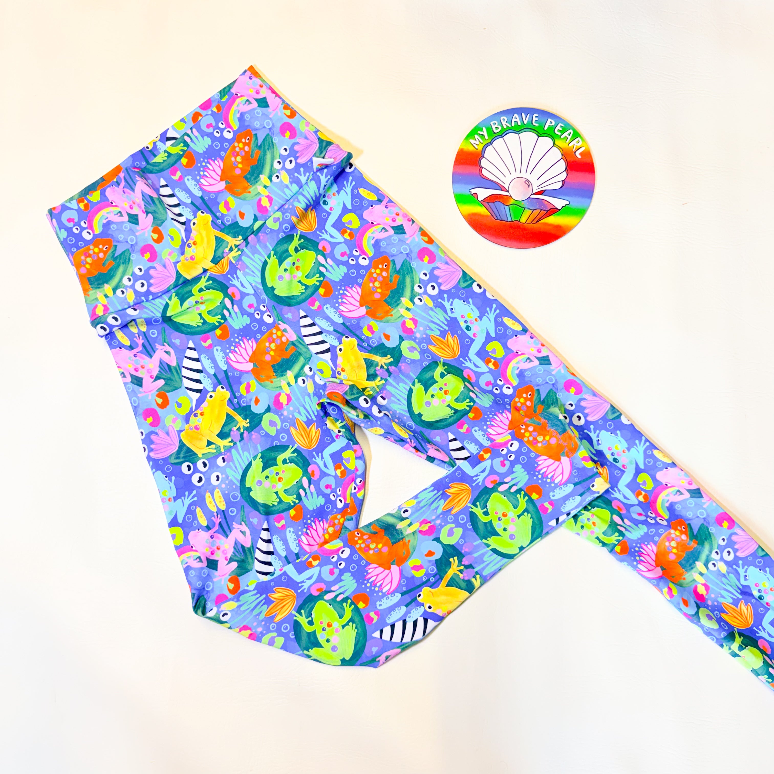 Frogs are now Instock! Featuring bright rainbow frogs on lily pads and rainbows on a shades of blue background.