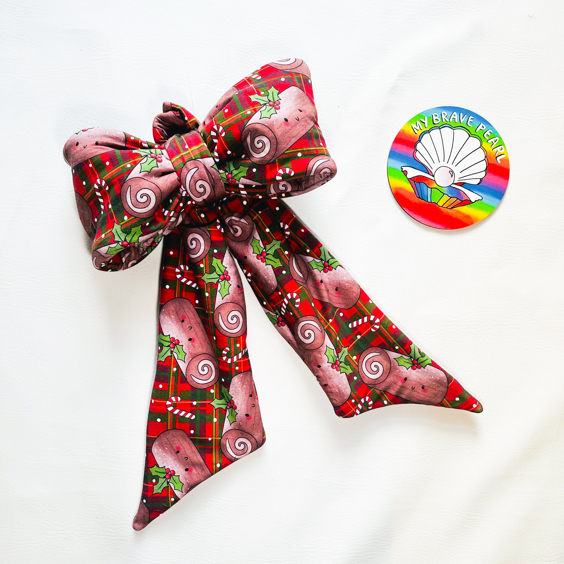 The bows are made from soft and stretchy cotton Lycra or French Terry with a polar fleece core for structure. They have a removable poppered loop to hang them up.