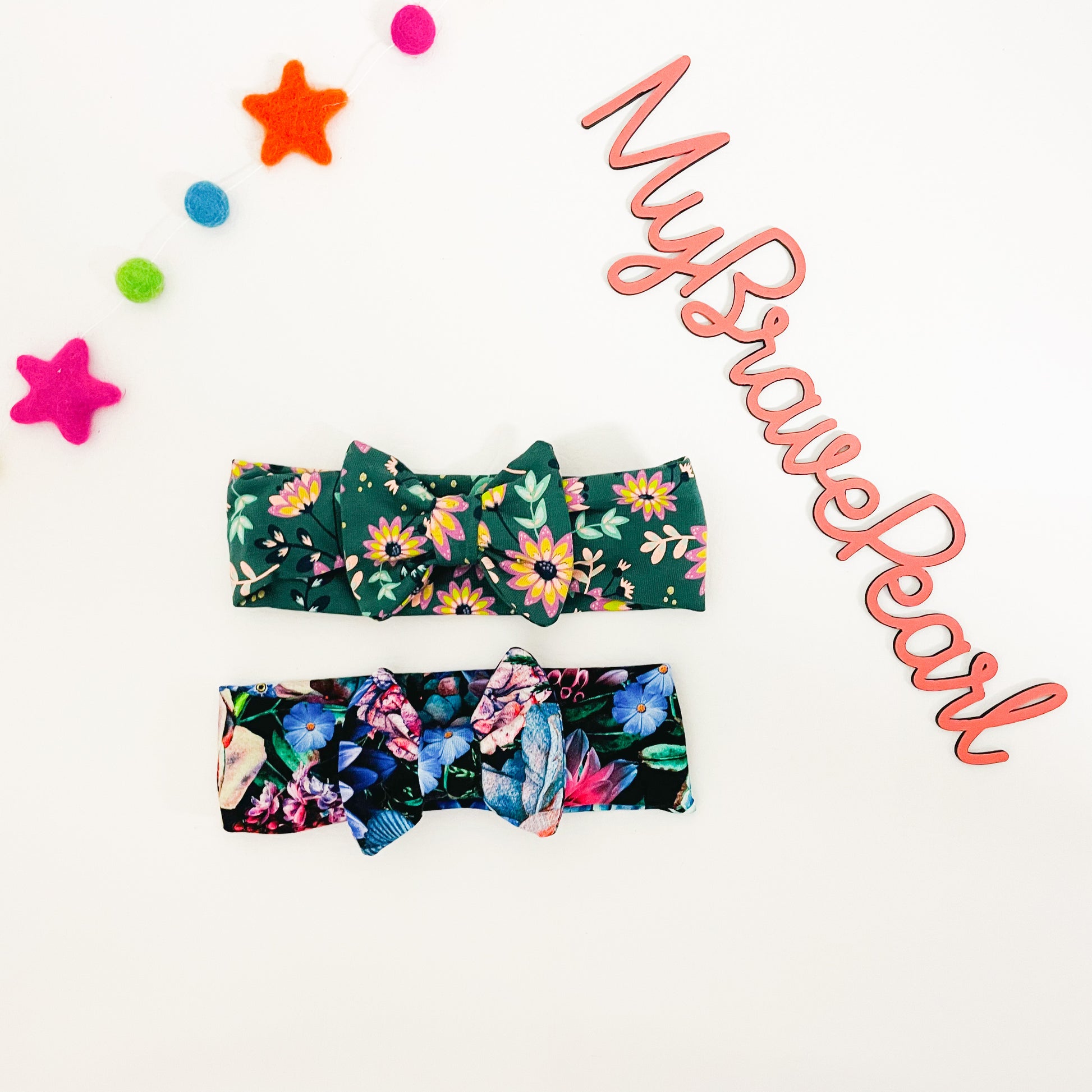 Our Bow Headbands are made from soft and stretchy cotton Lycra or French terry. Usually they can be made out of offcuts!
