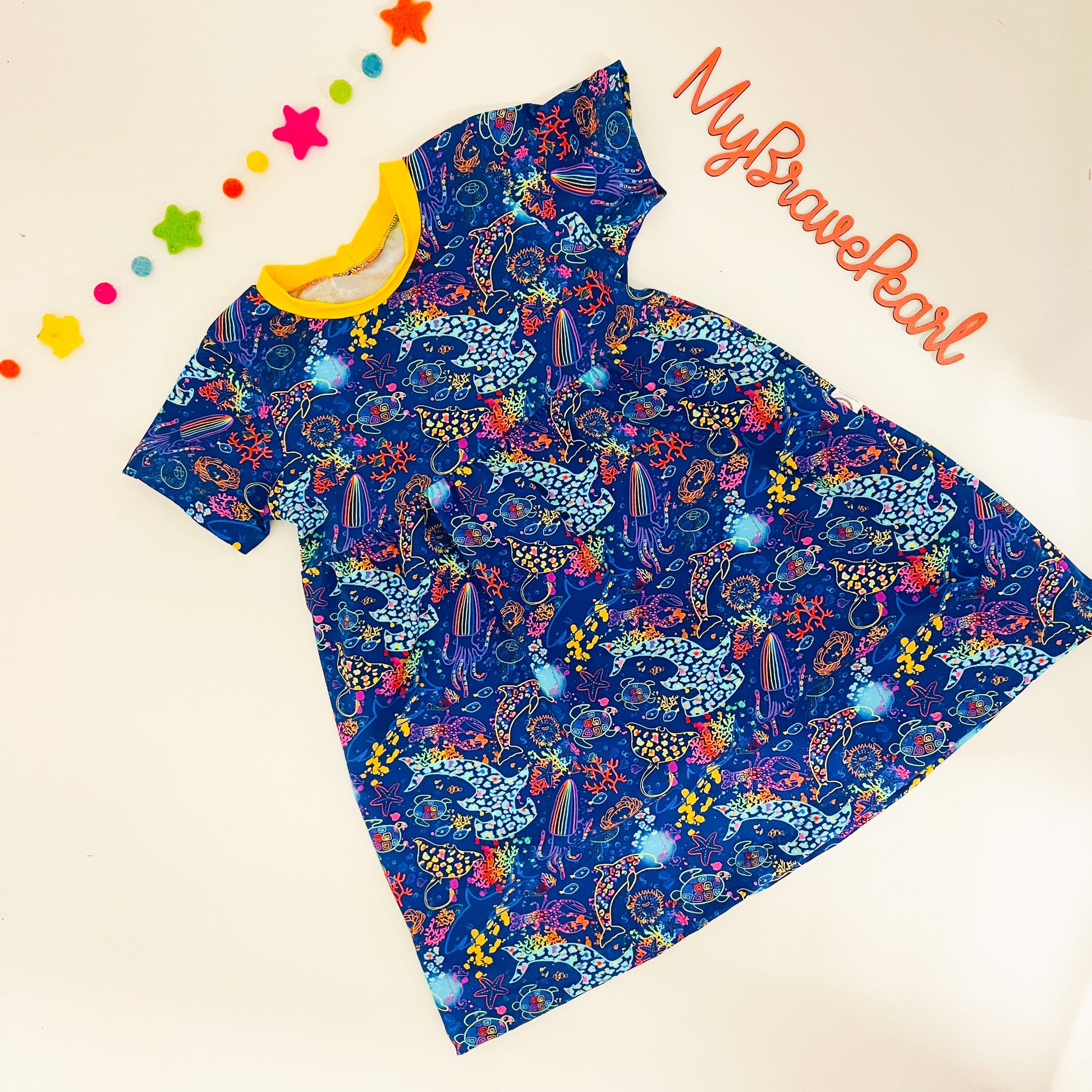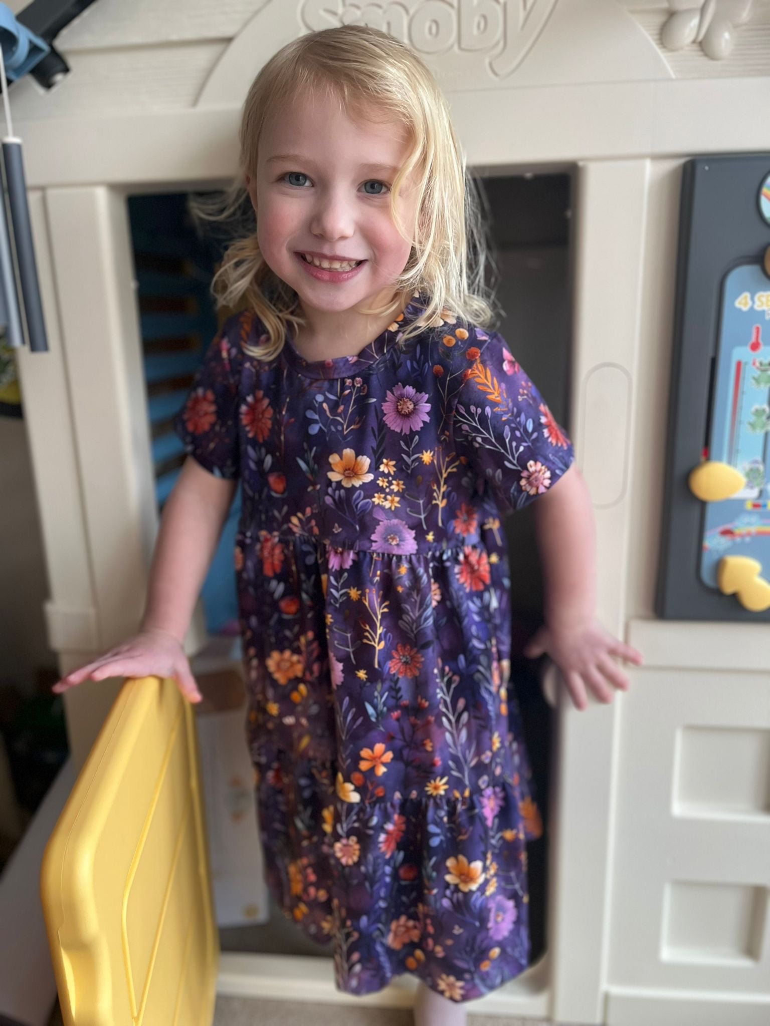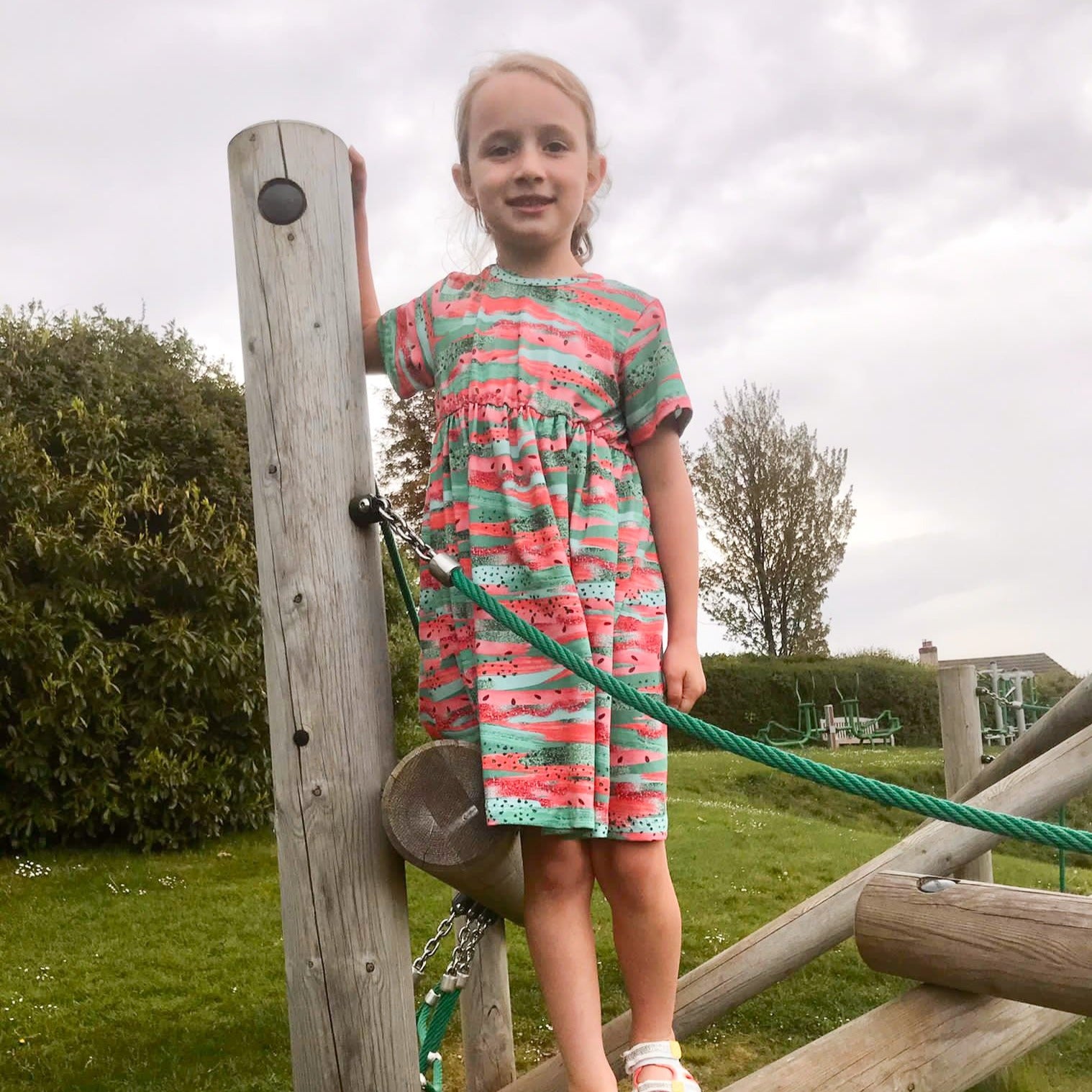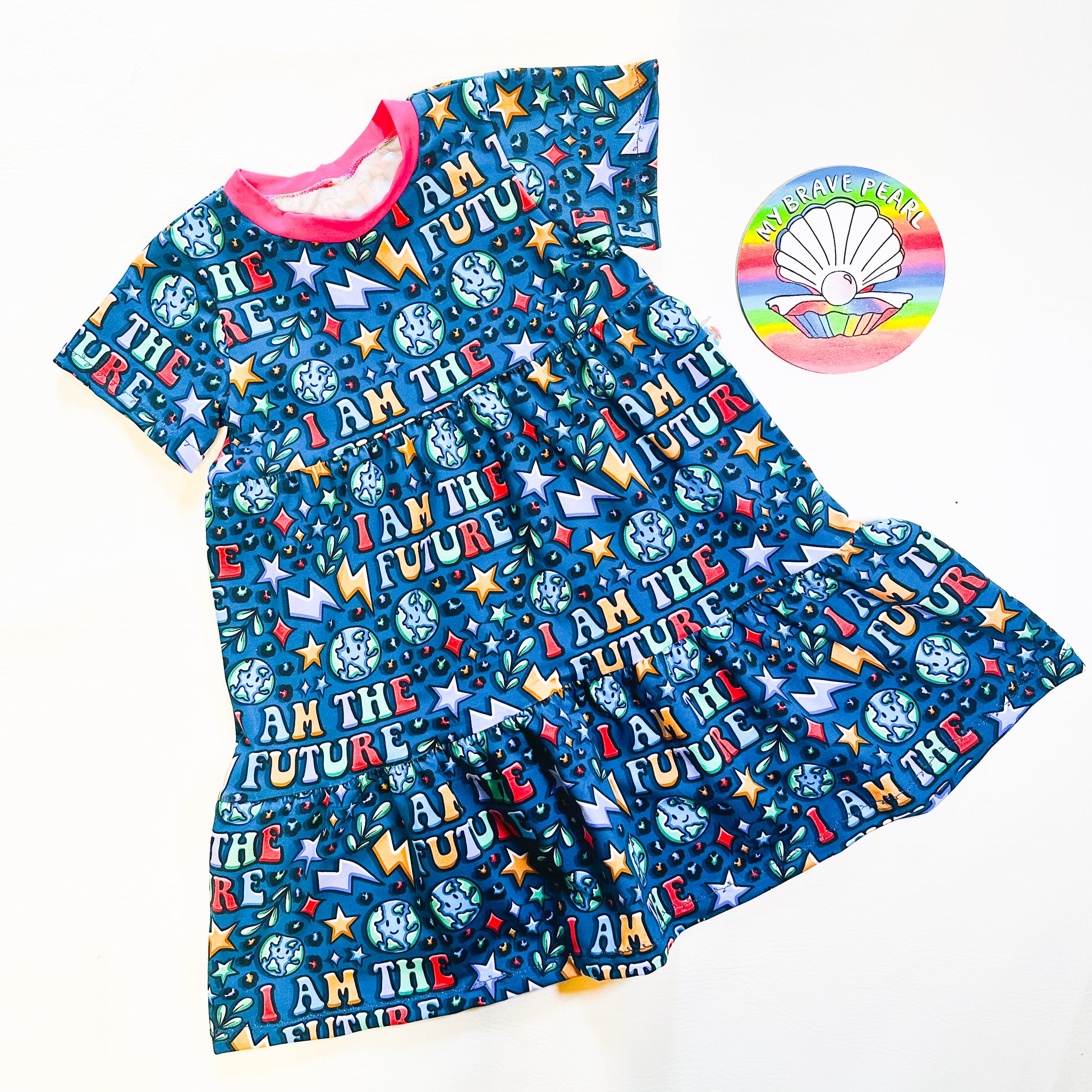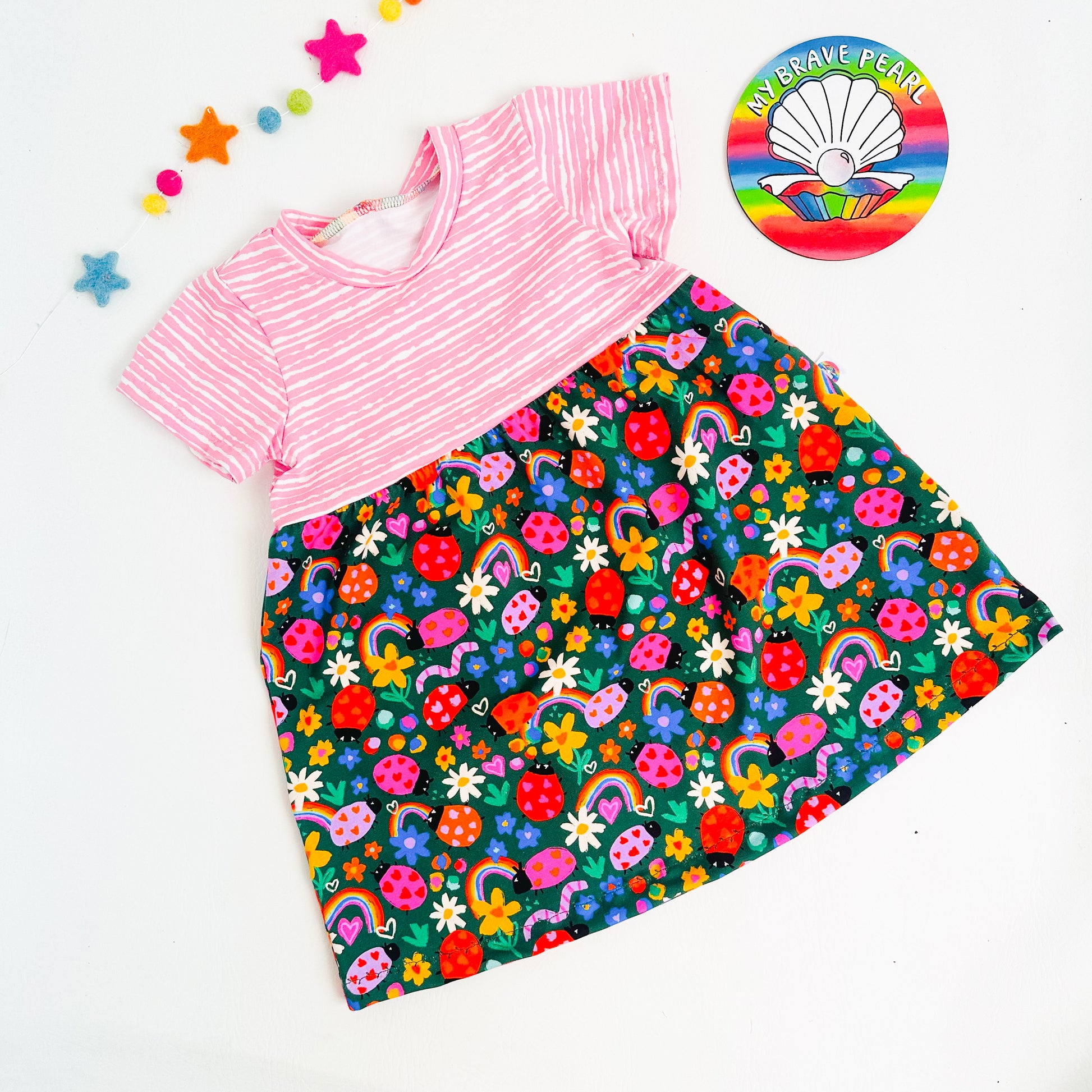 Our Kids Dotty Dresses are crafted from soft and stretchy Cotton Lycra and feature rainbow overlocked internal seams for comfort. They have a relaxed fit bodice gathered at the waist with the choice of a simple or 2 tier skirt.