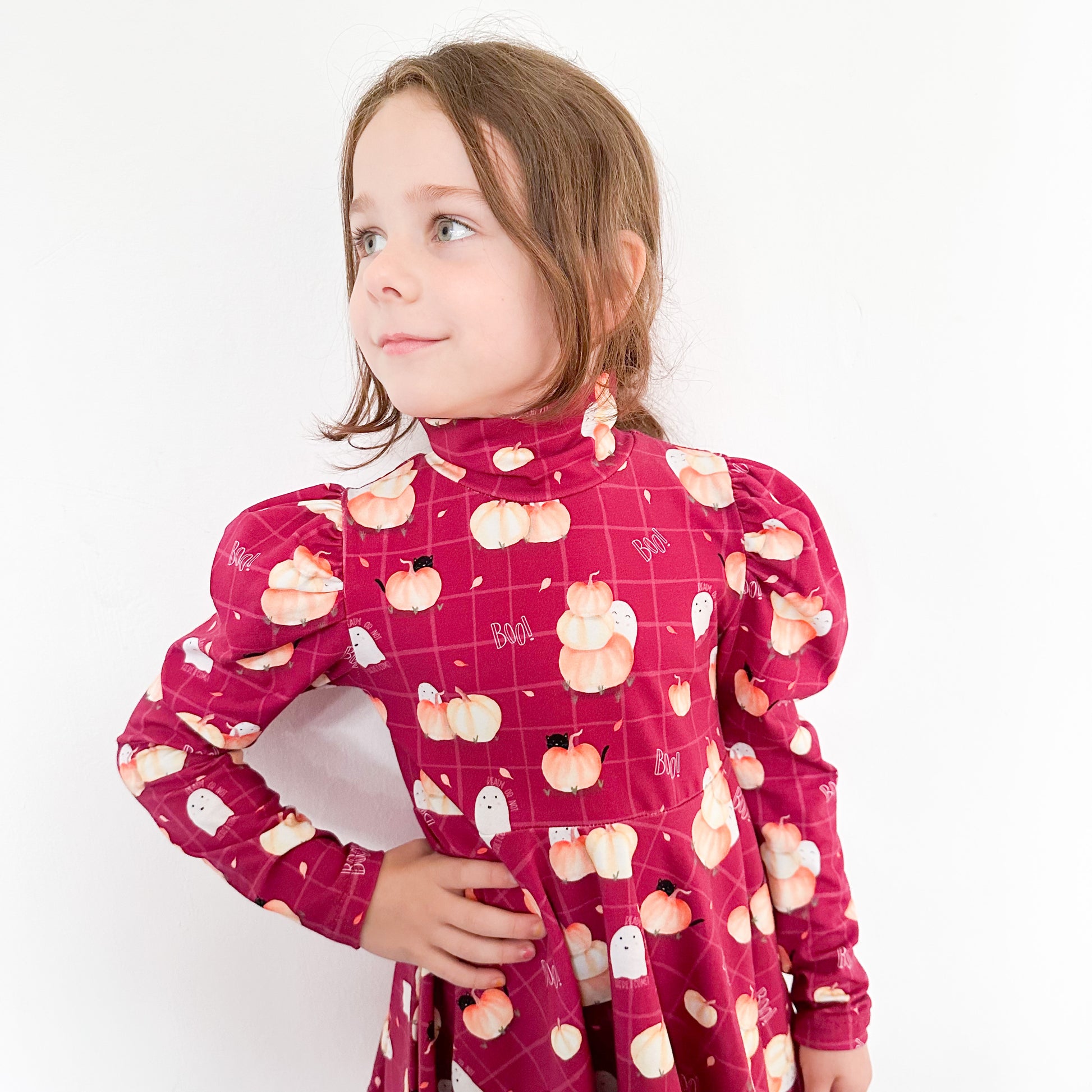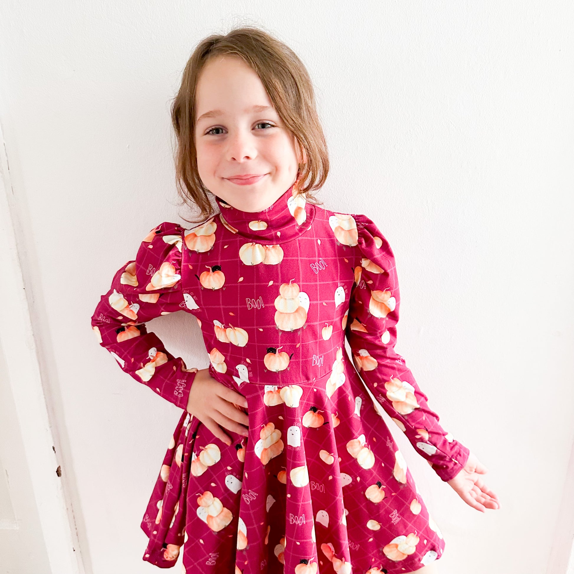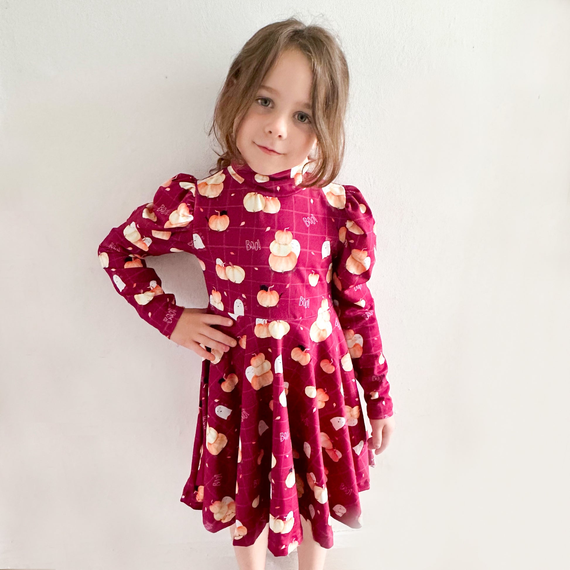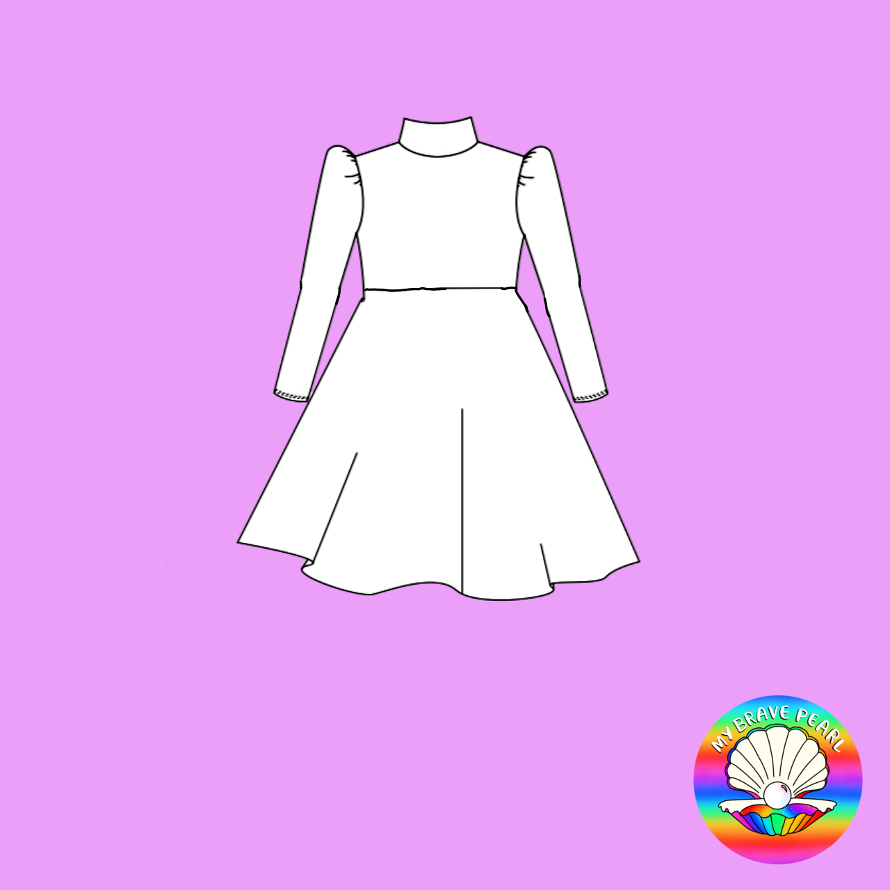 Our Kids Dresses are crafted from soft and stretchy Cotton Lycra and feature rainbow overlocked internal seams for comfort. They have a gathered and ruched sleeve, a full circle skirt and a mock roll neck.