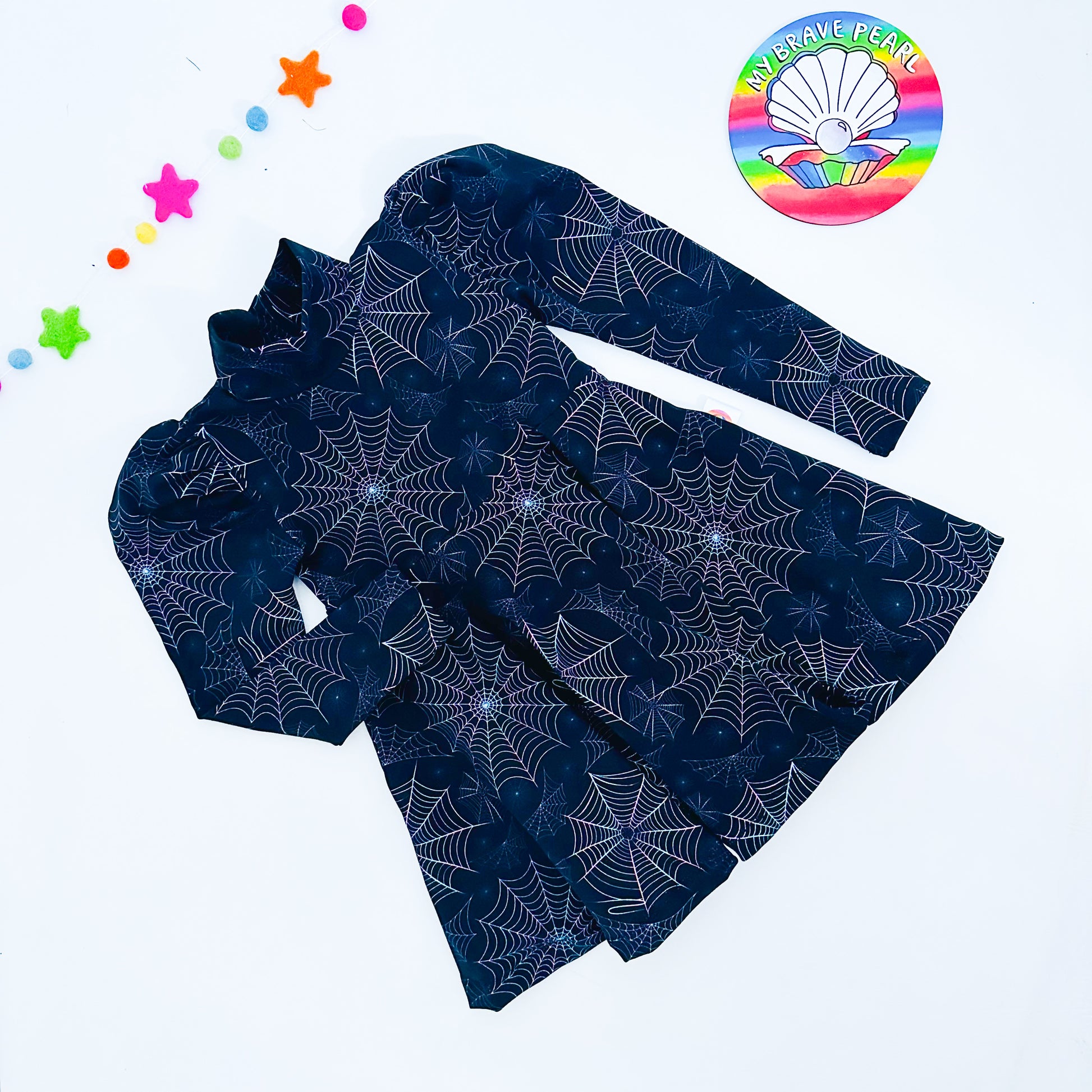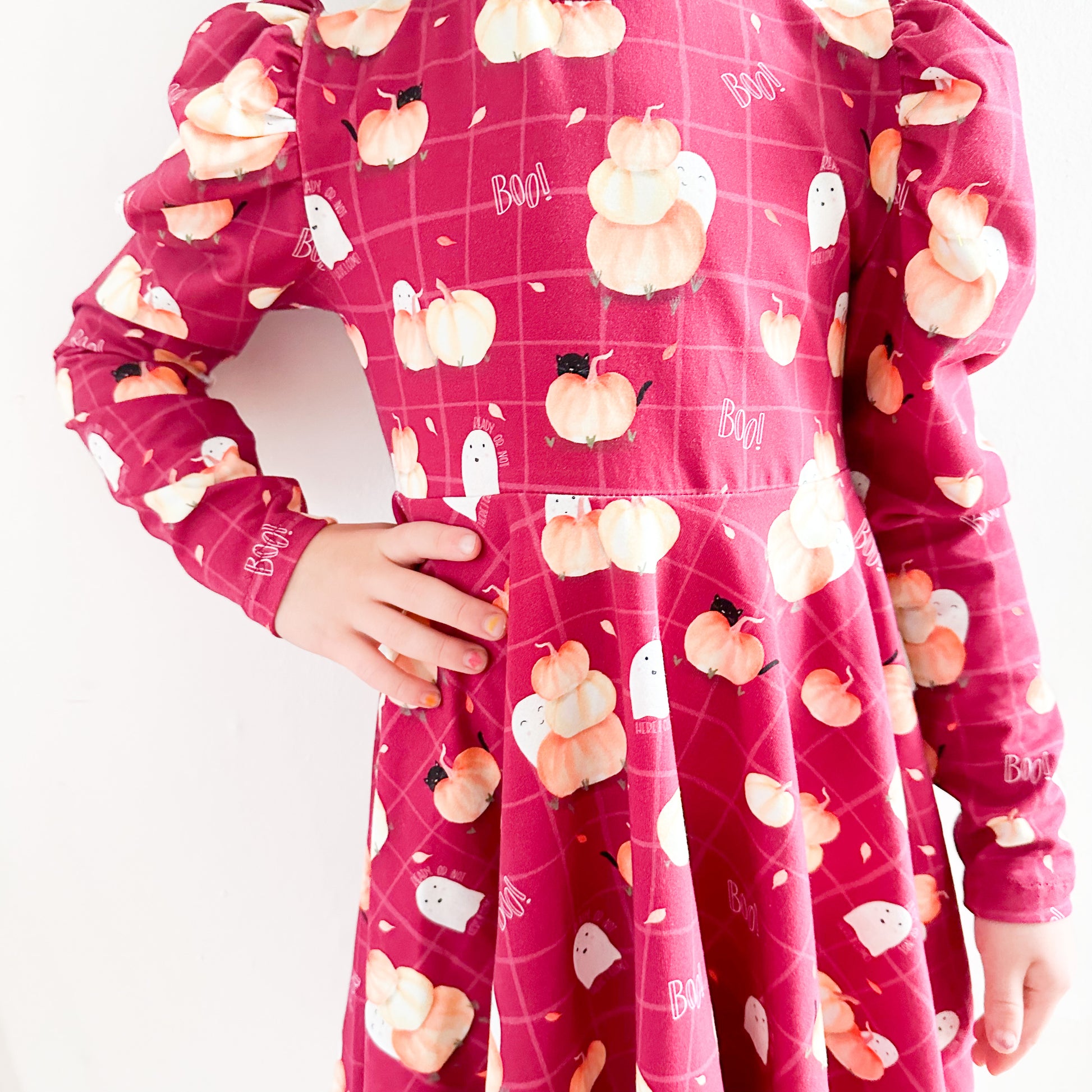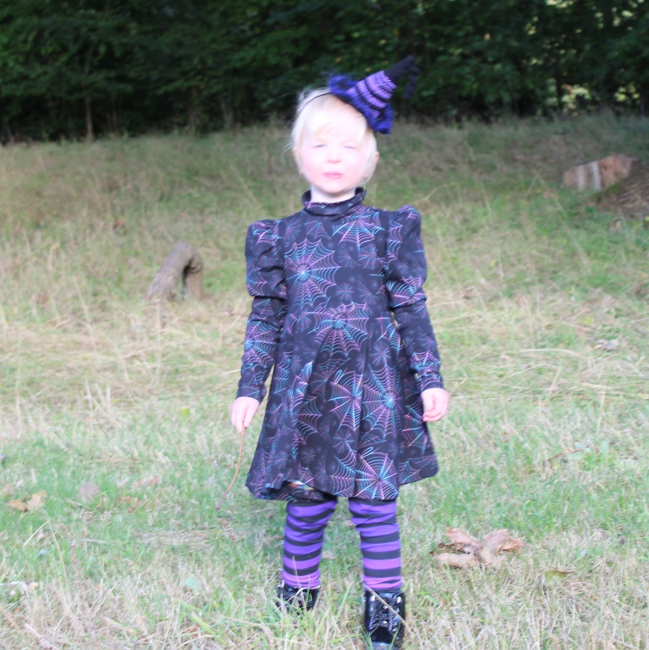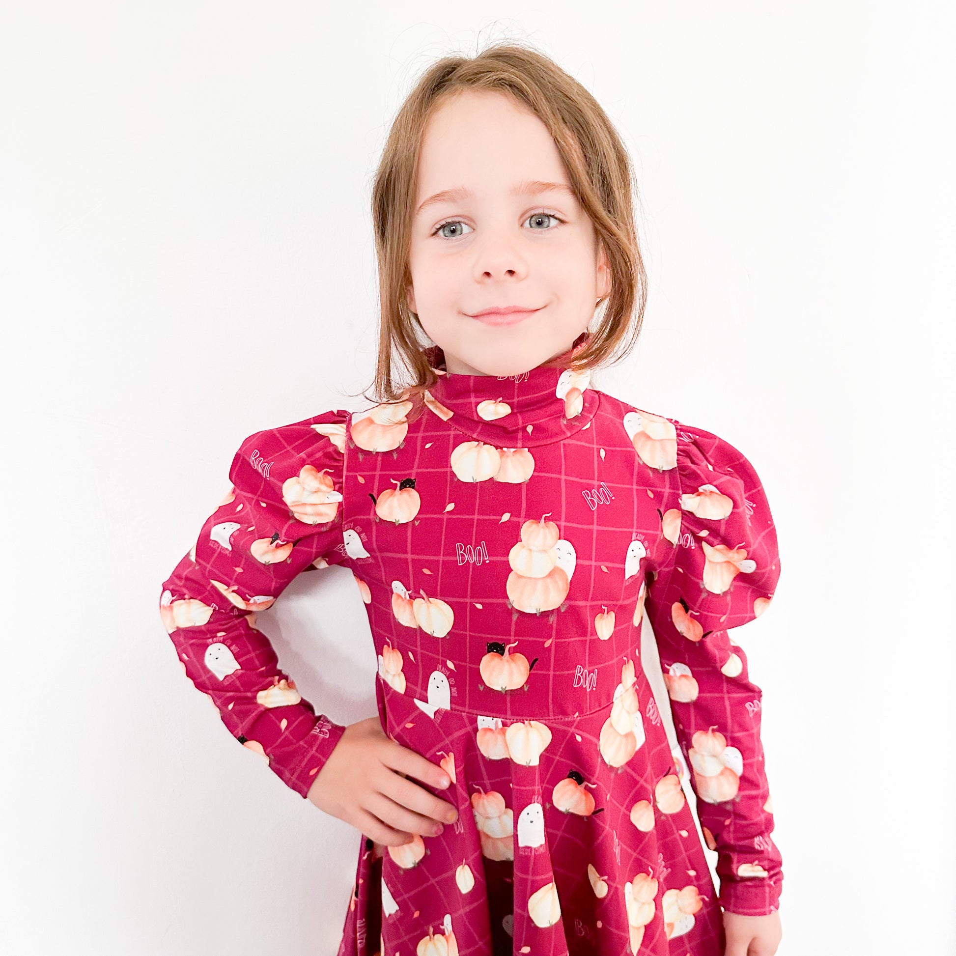 Our Kids Dresses are crafted from soft and stretchy Cotton Lycra and feature rainbow overlocked internal seams for comfort. They have a gathered and ruched sleeve, a full circle skirt and a mock roll neck.