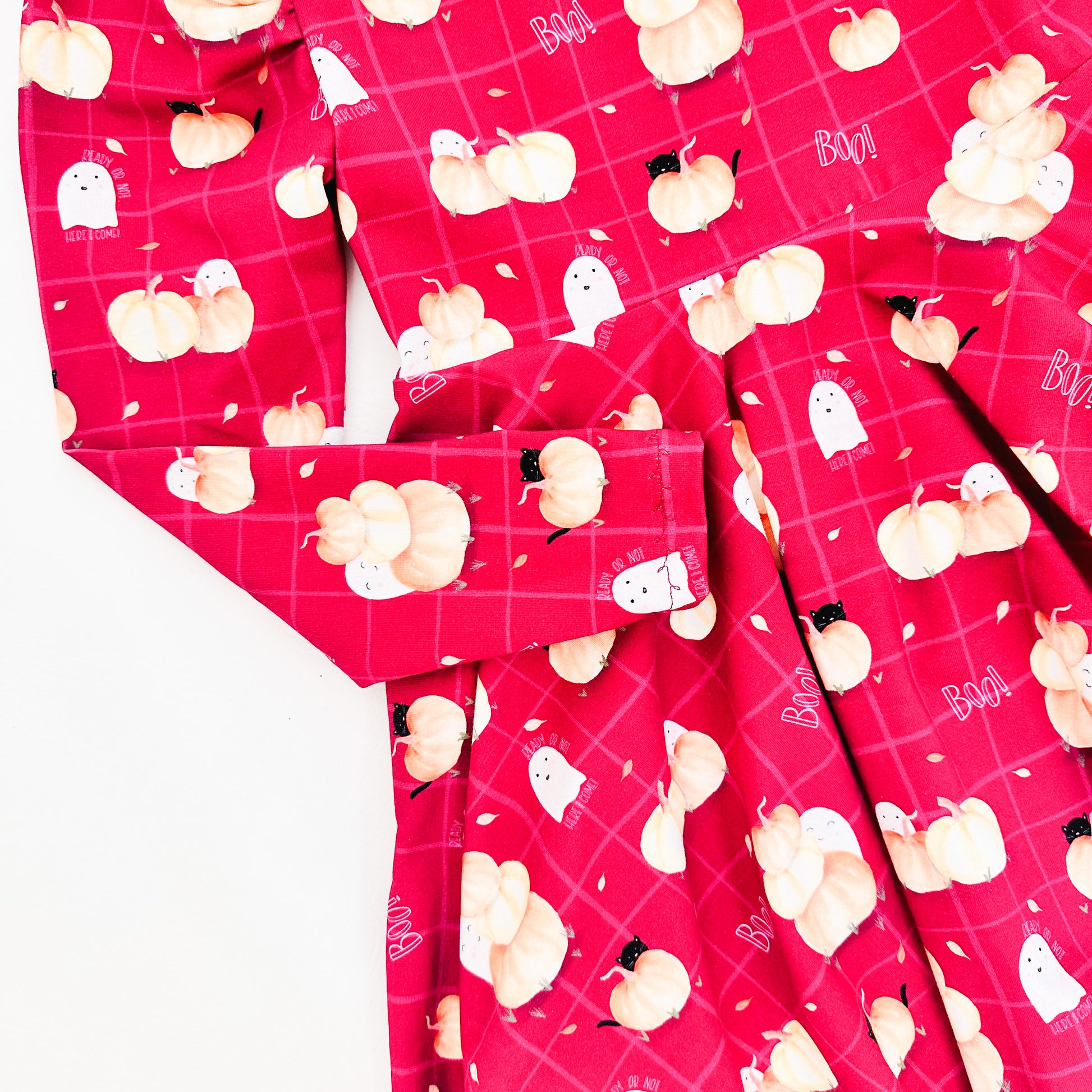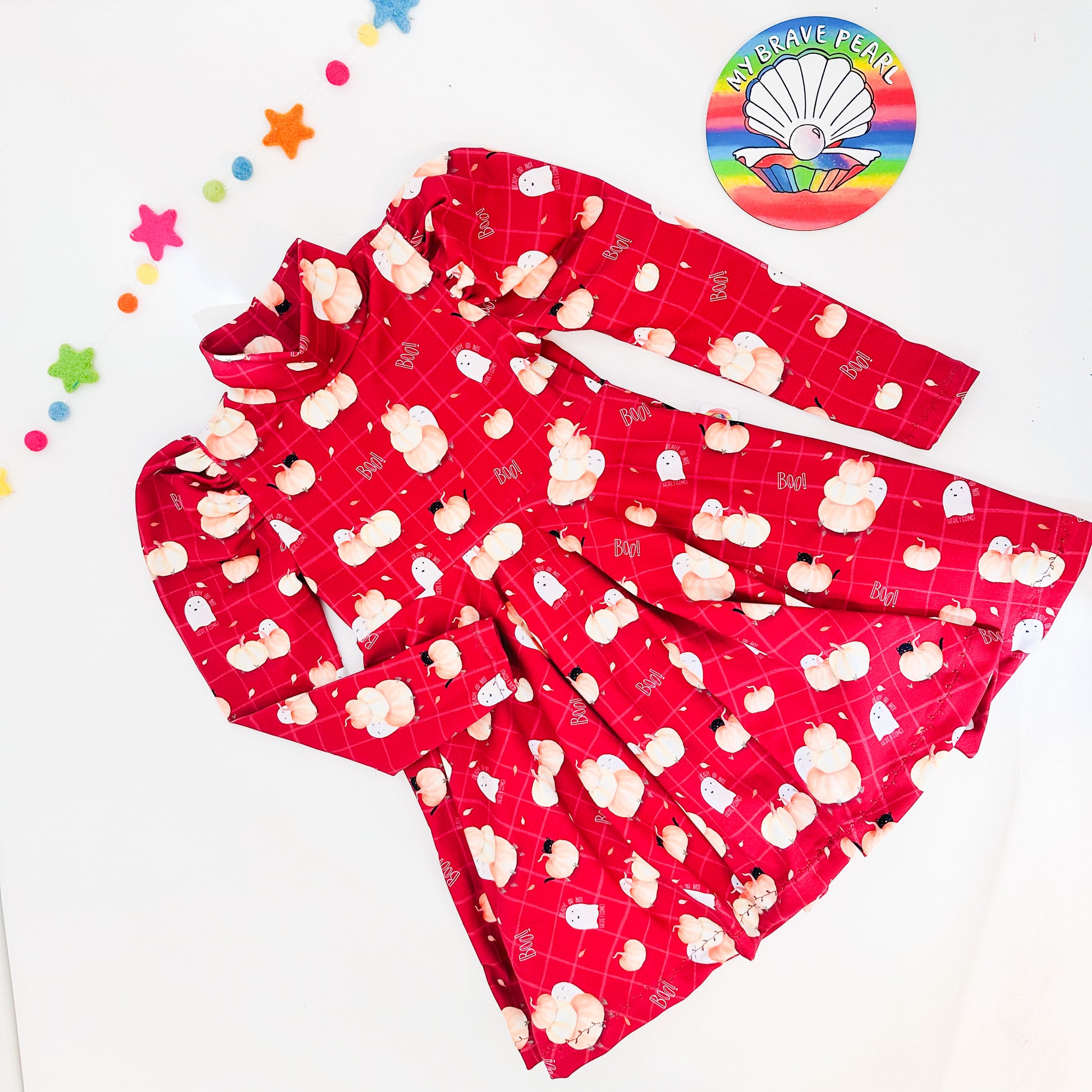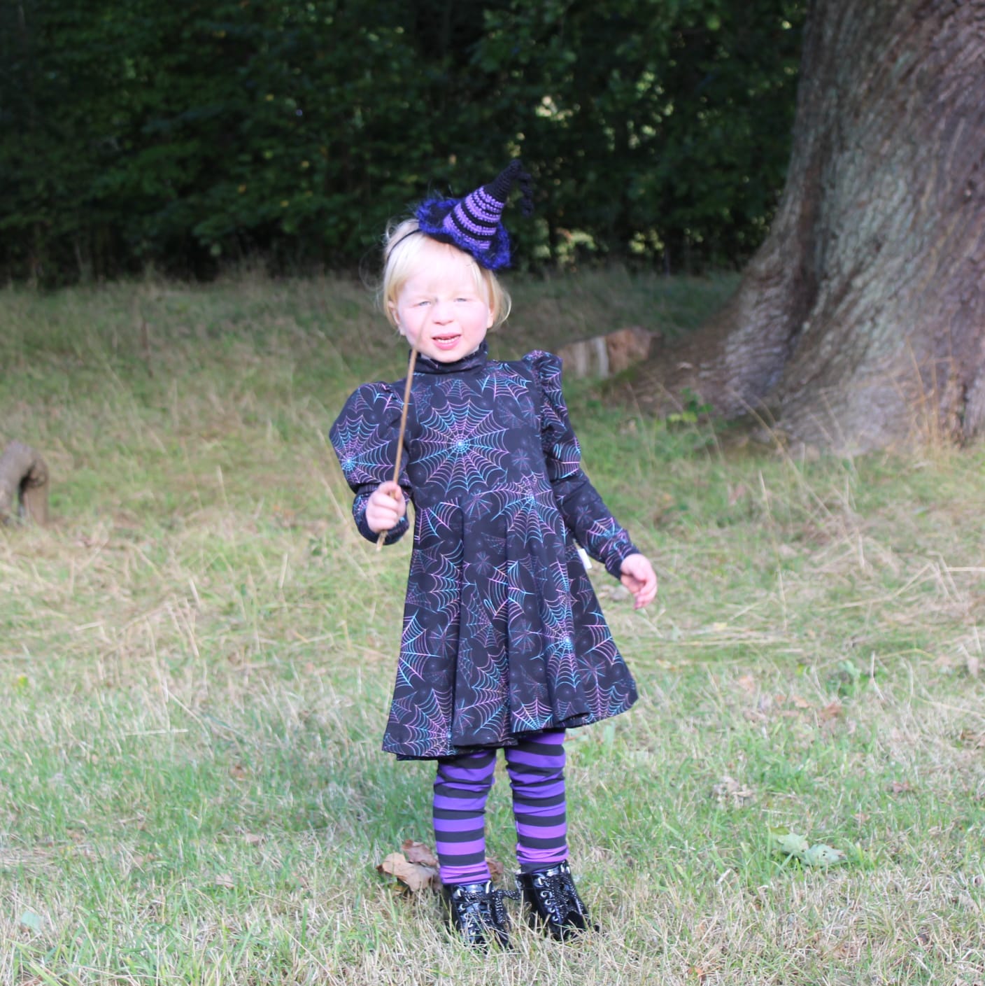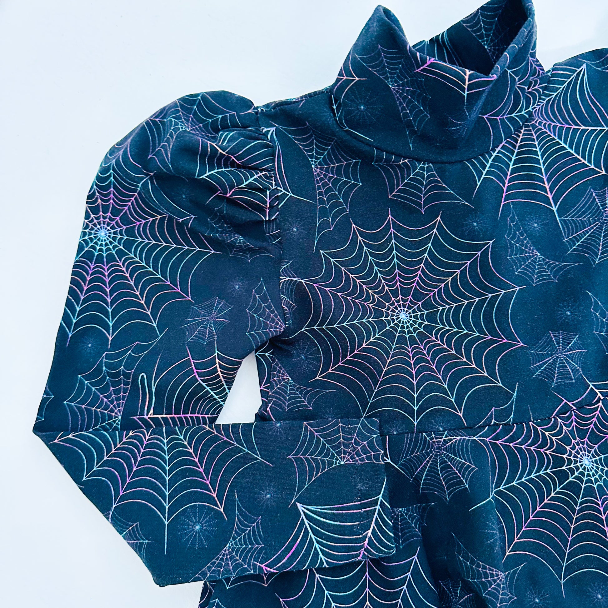 Our Kids Dresses are crafted from soft and stretchy Cotton Lycra and feature rainbow overlocked internal seams for comfort. They have a gathered and ruched sleeve, a full circle skirt and a mock roll neck.