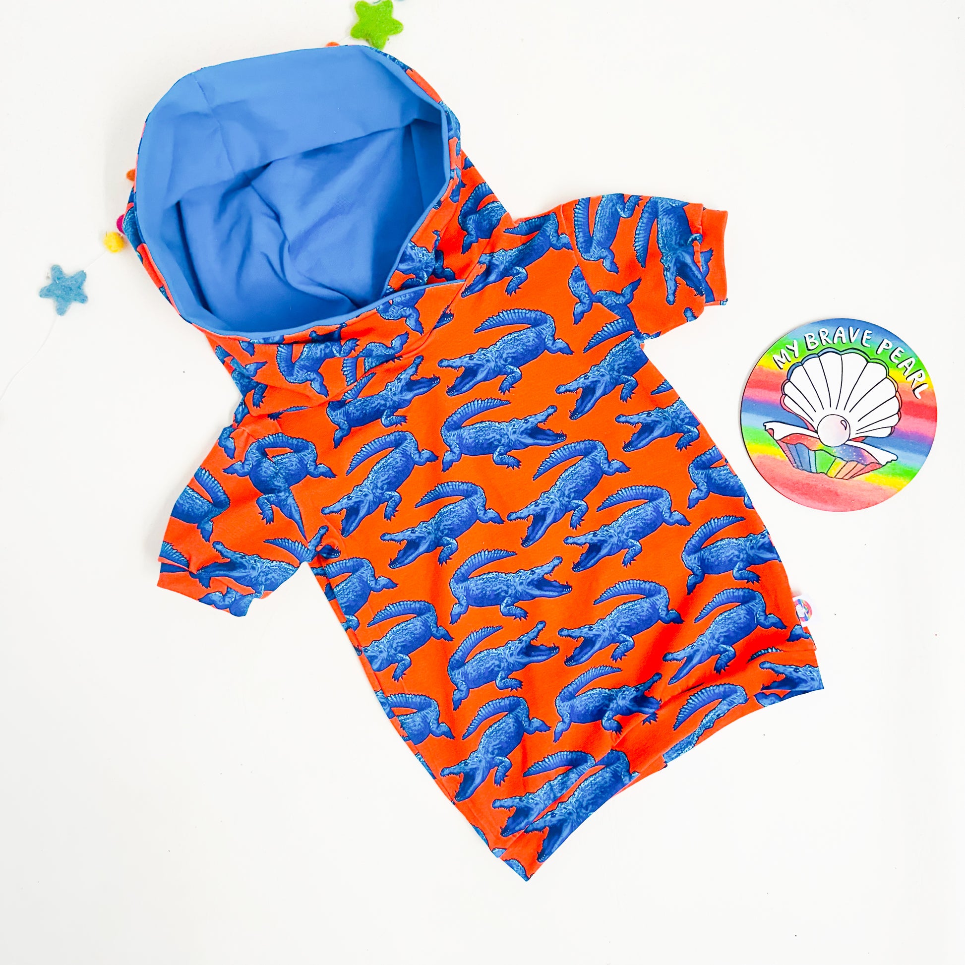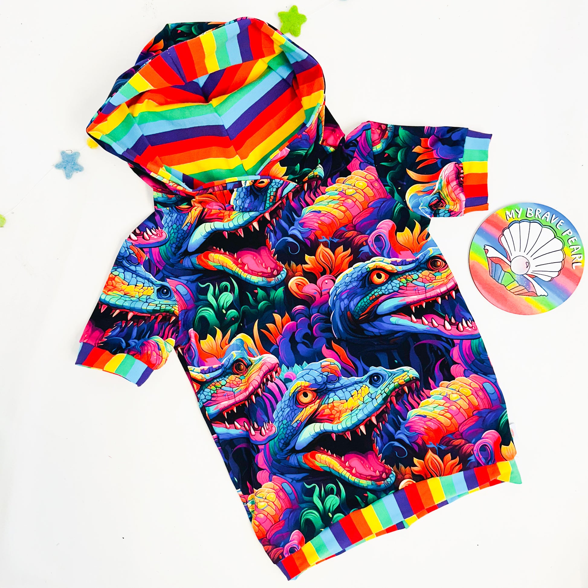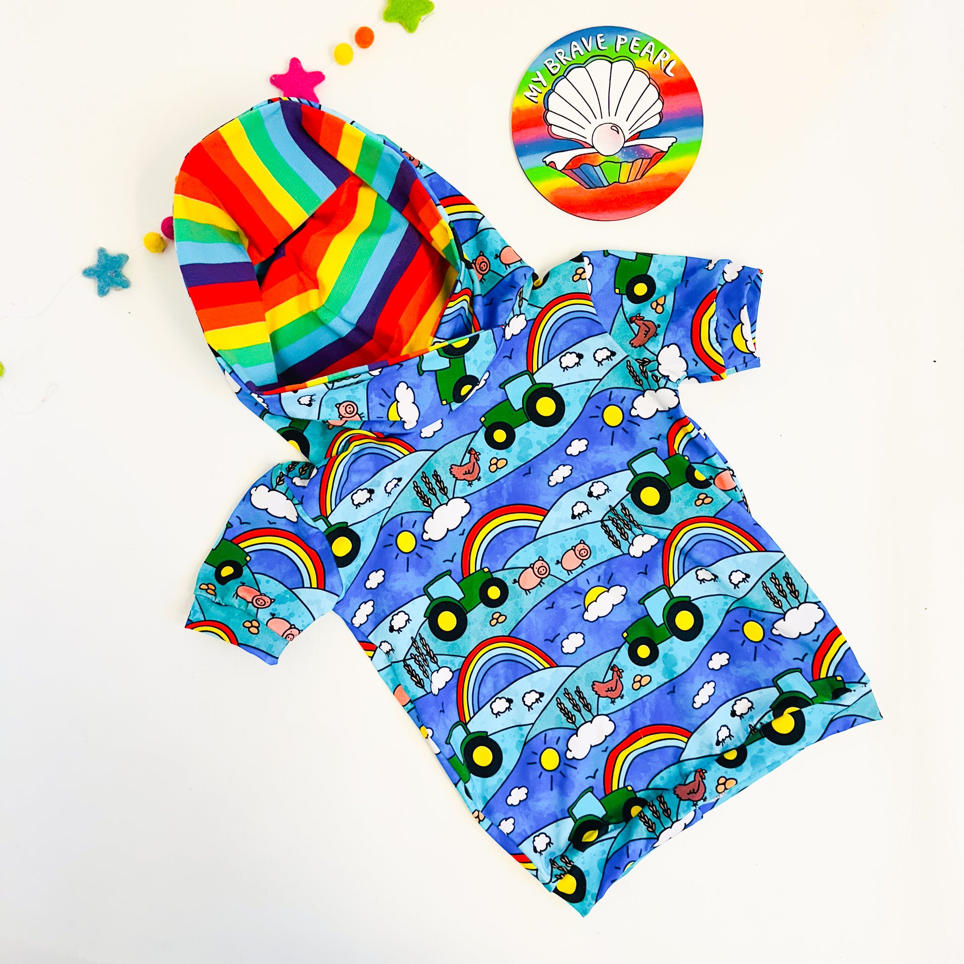 Our Kids Hooded Tees are crafted from soft and stretchy Cotton Lycra and feature rainbow overlocker seams for comfort. They have a set in sleeve and bands on the sleeves and waist. They are a slim fit.