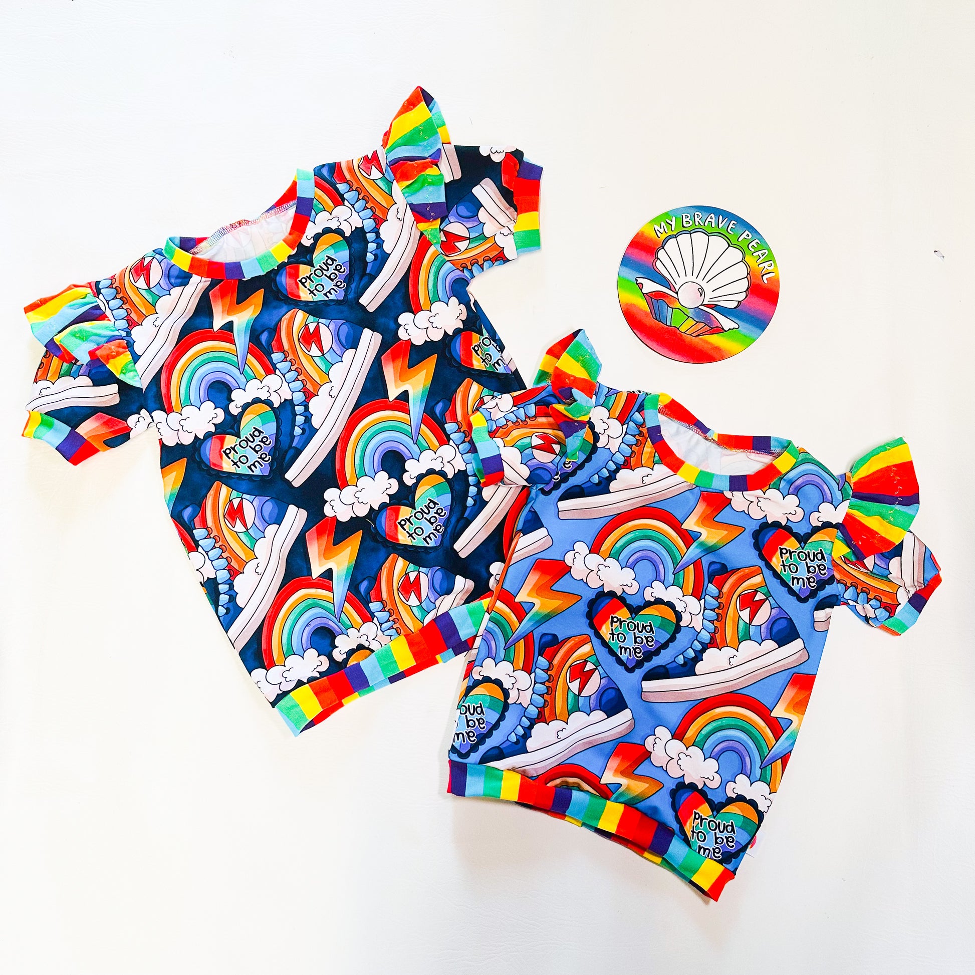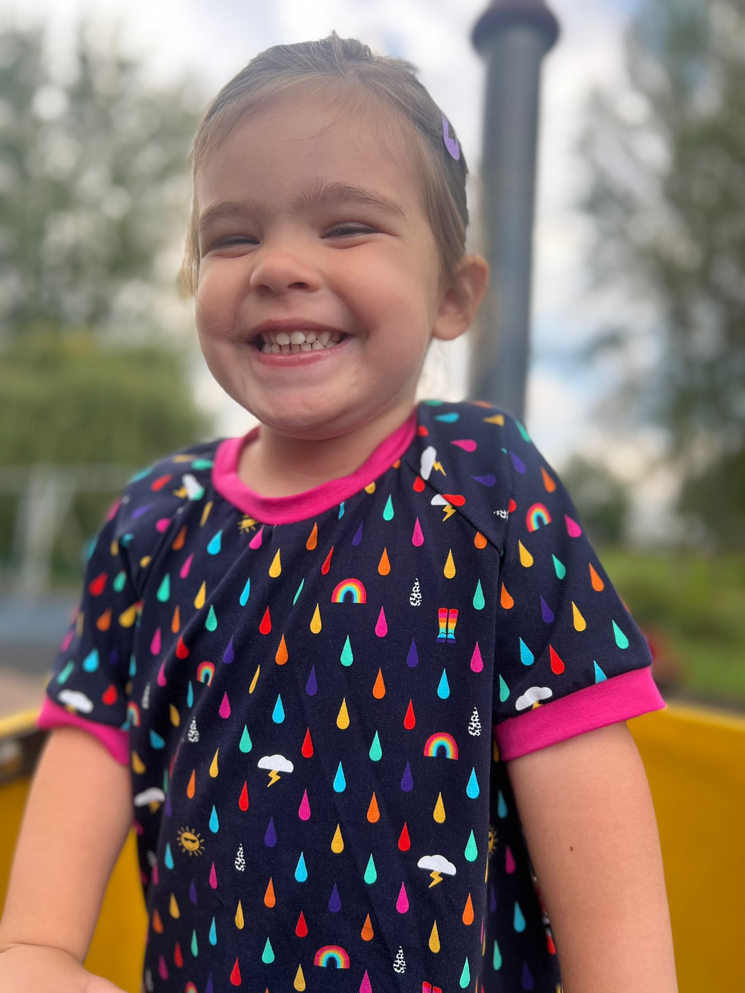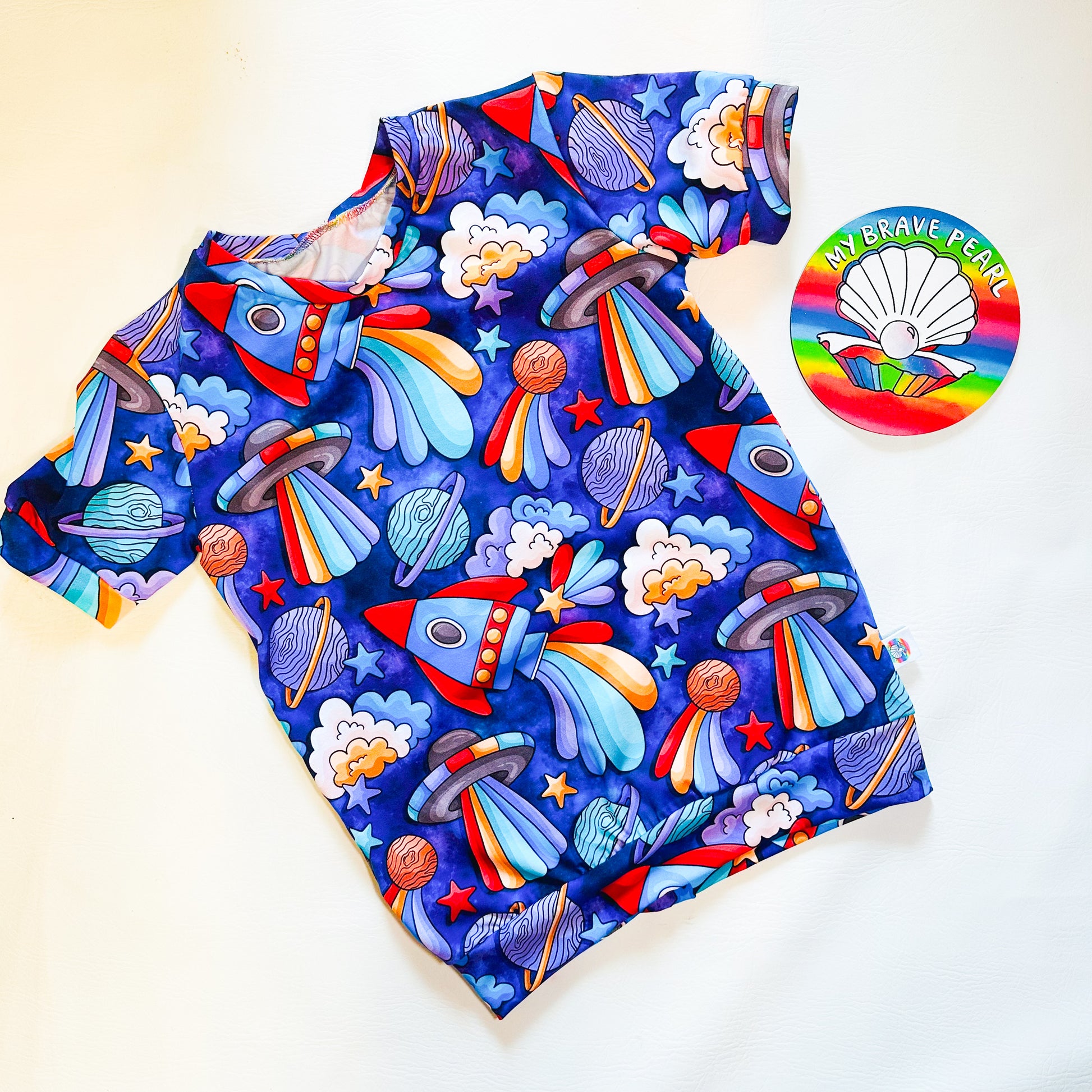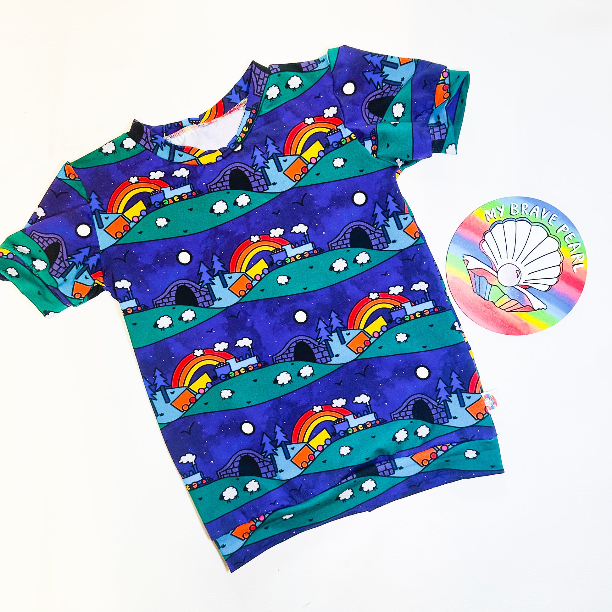 Our Kids Tees are crafted from soft and stretchy Cotton Lycra and feature rainbow overlocker seams for comfort. They have a short set in sleeve and bands on the neck, sleeves and waist. They are a slim fit.