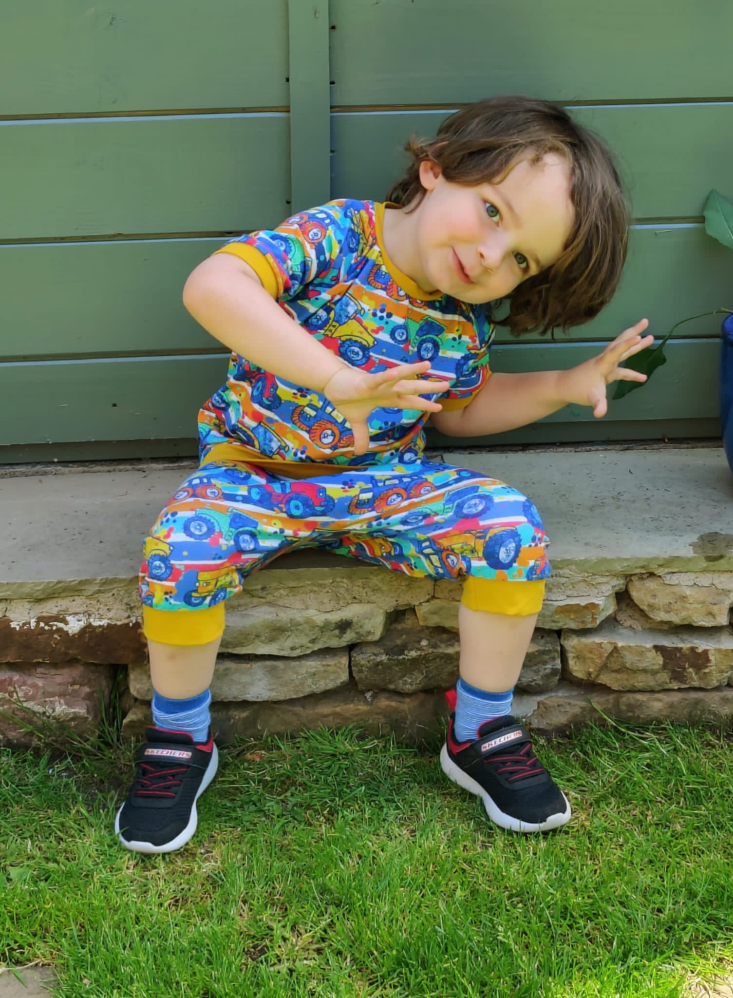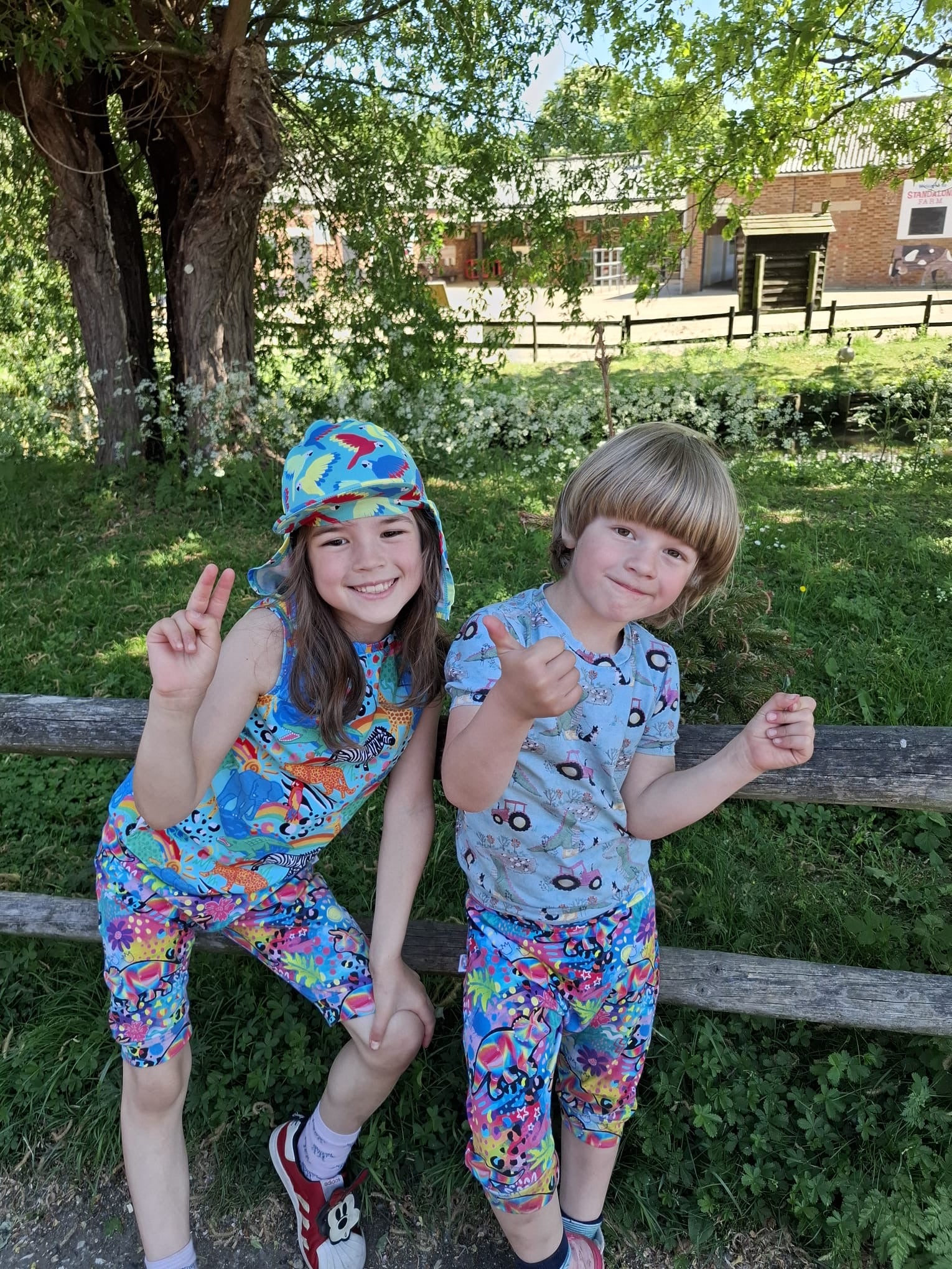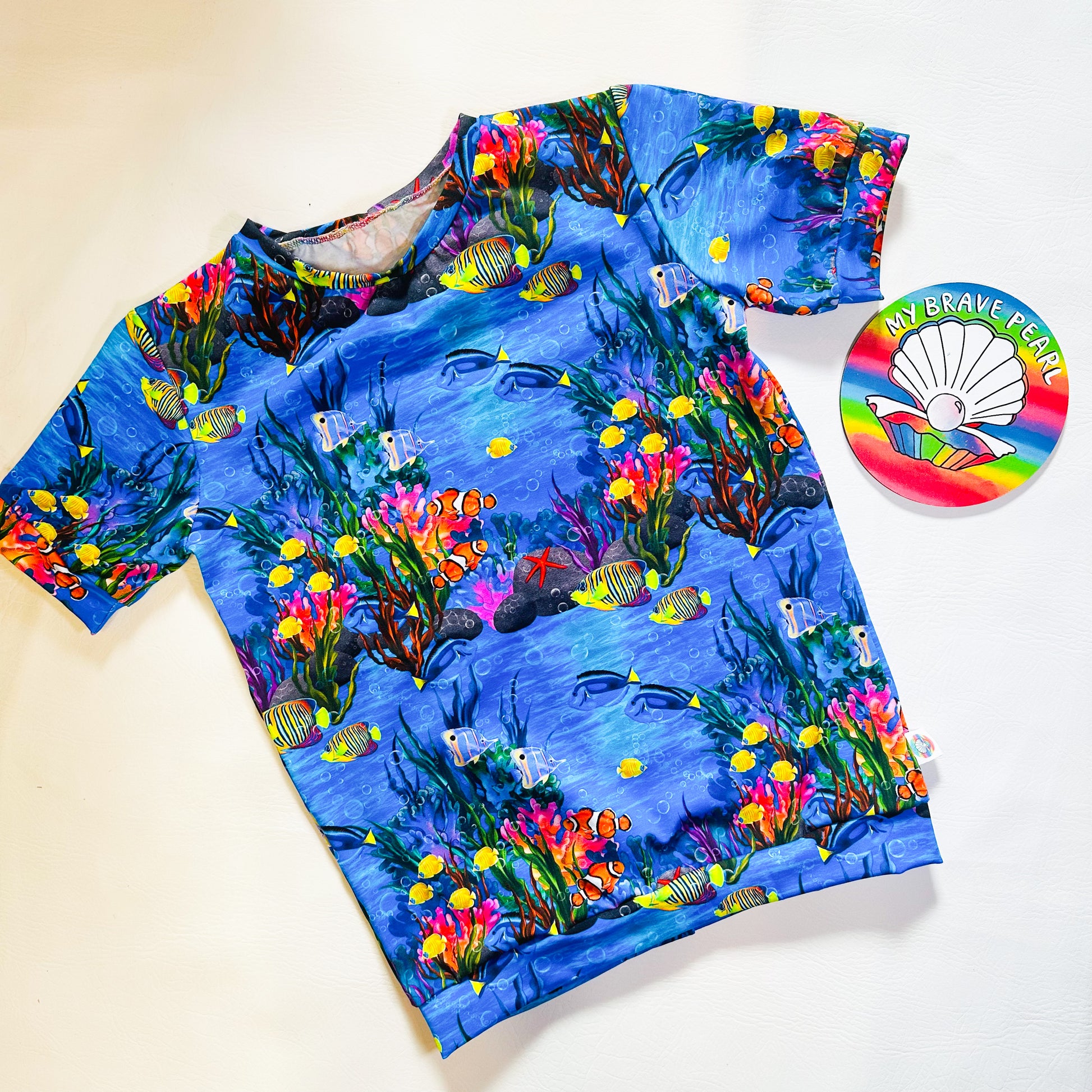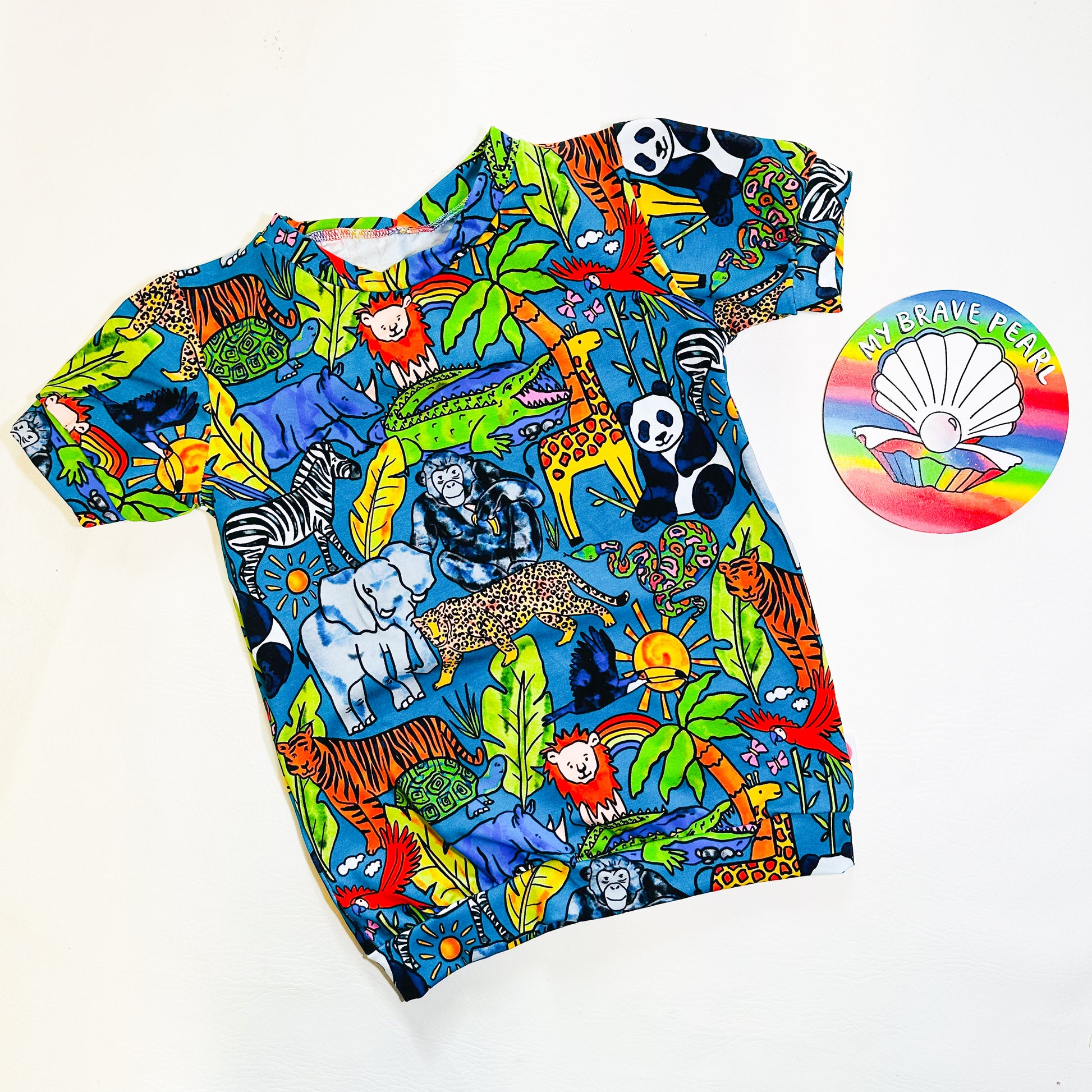Our Kids Tees are crafted from soft and stretchy Cotton Lycra and feature rainbow overlocker seams for comfort. They have a short set in sleeve and bands on the neck, sleeves and waist. They are a slim fit.