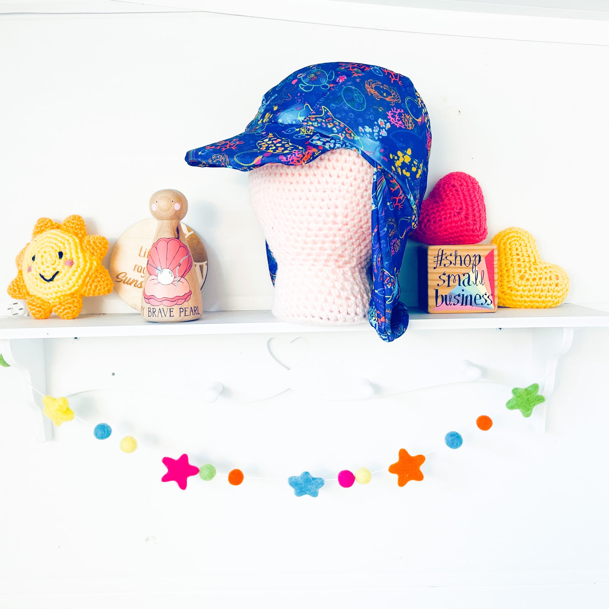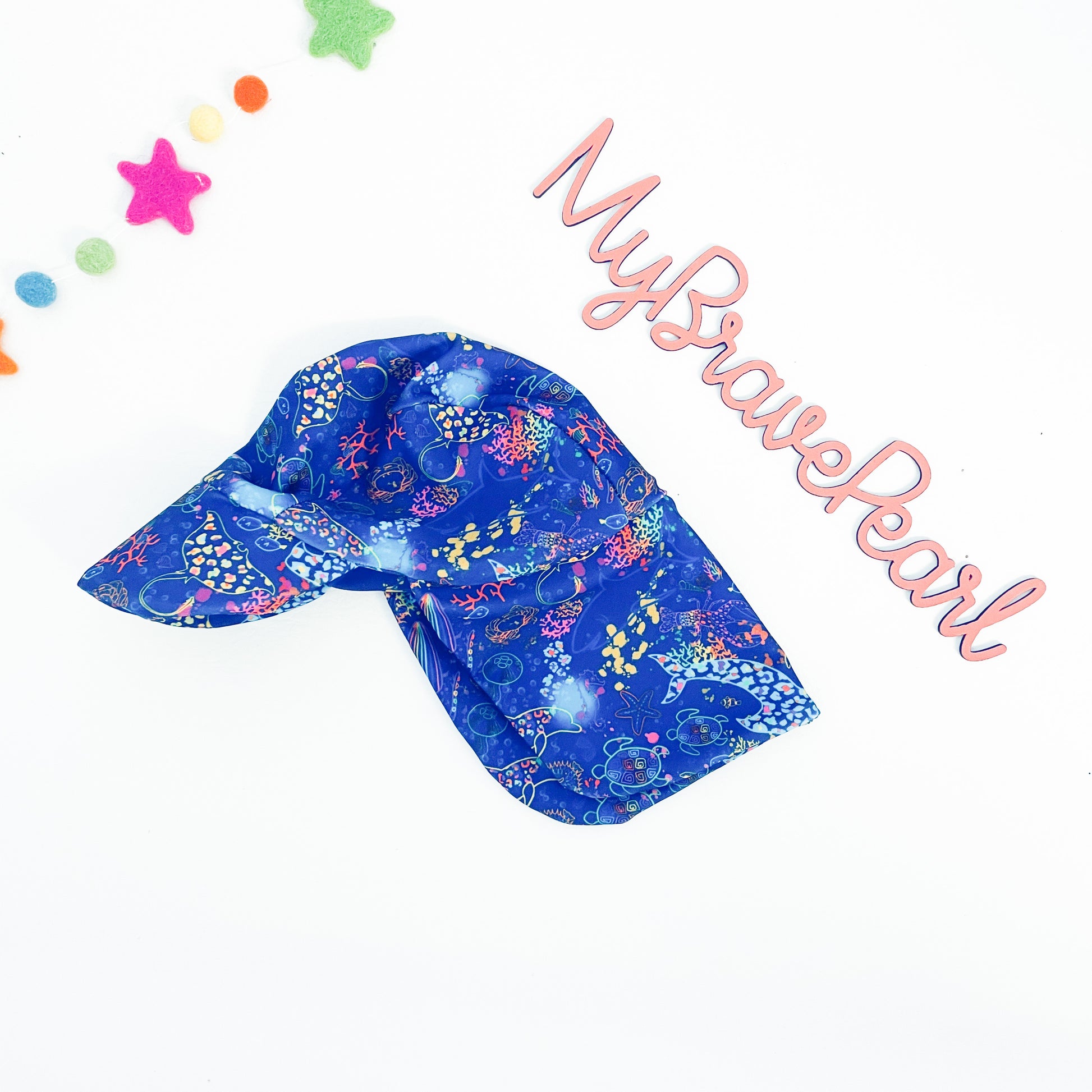 Our Peaked Swim Hats are made from SPF50 Polyester Lycra Swim Fabric.