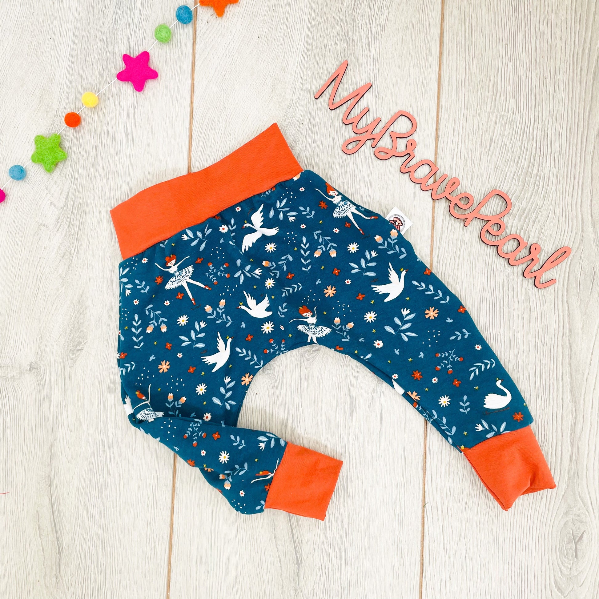Our kids harems are made from soft and stretchy cotton Lycra or French Terry with a yoga waistband.