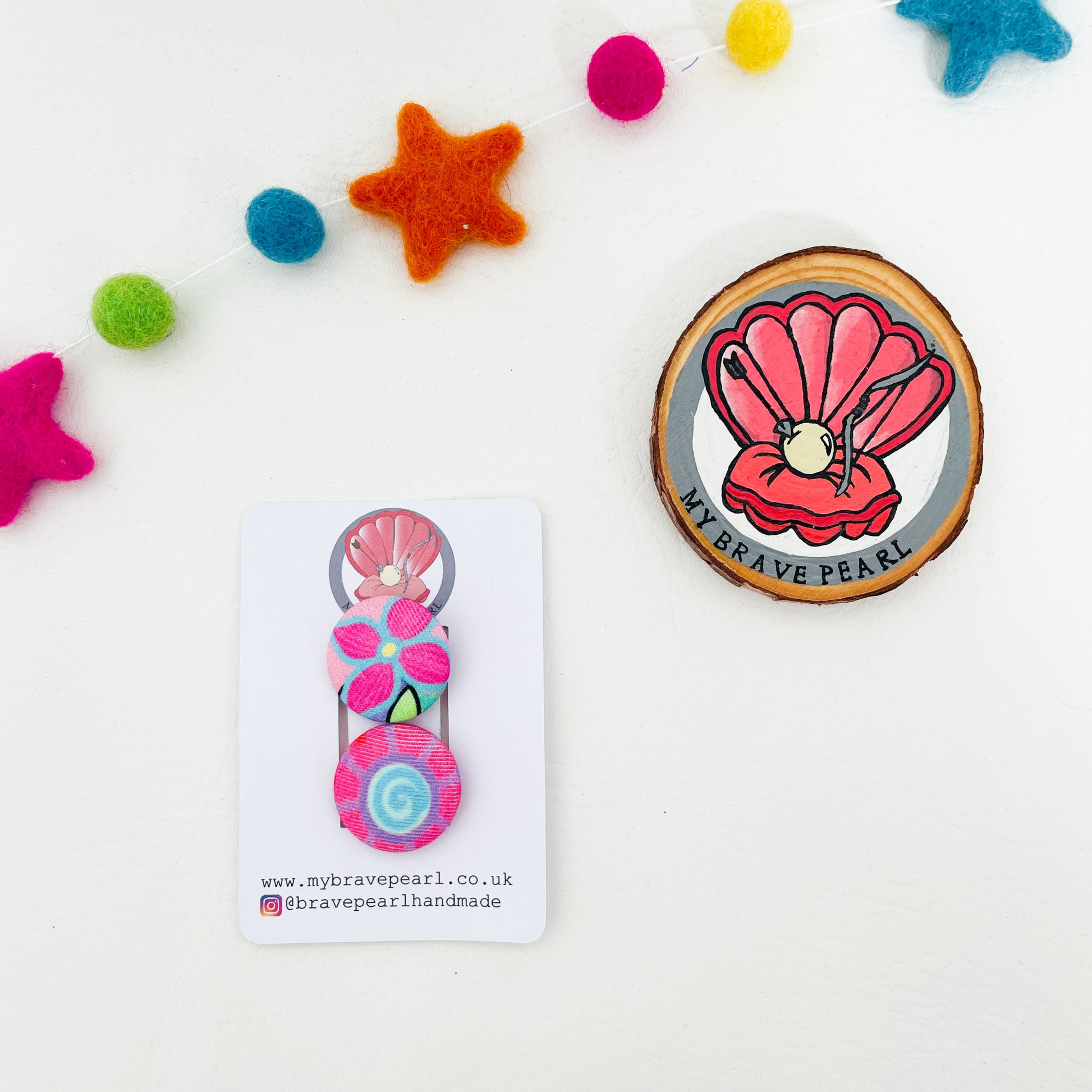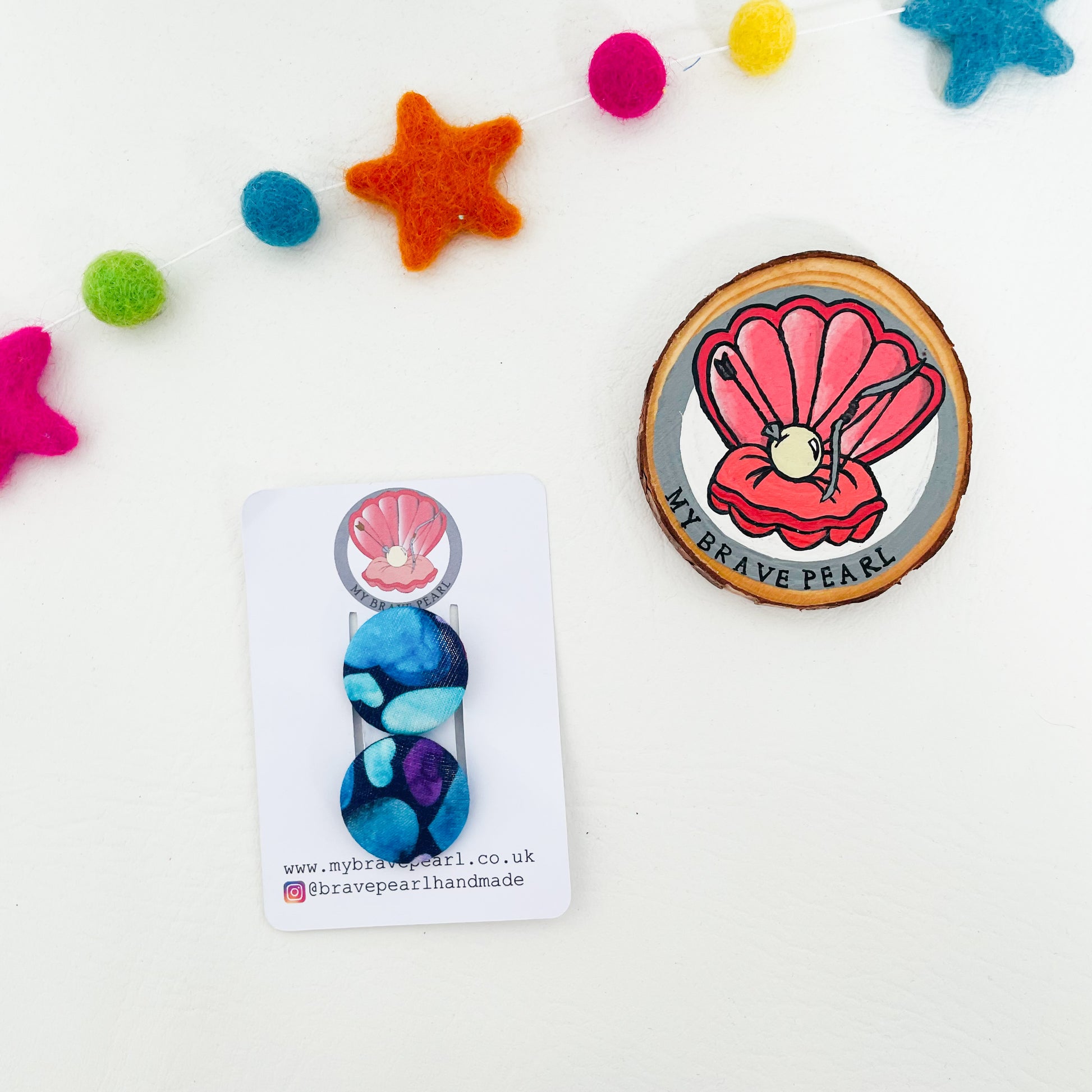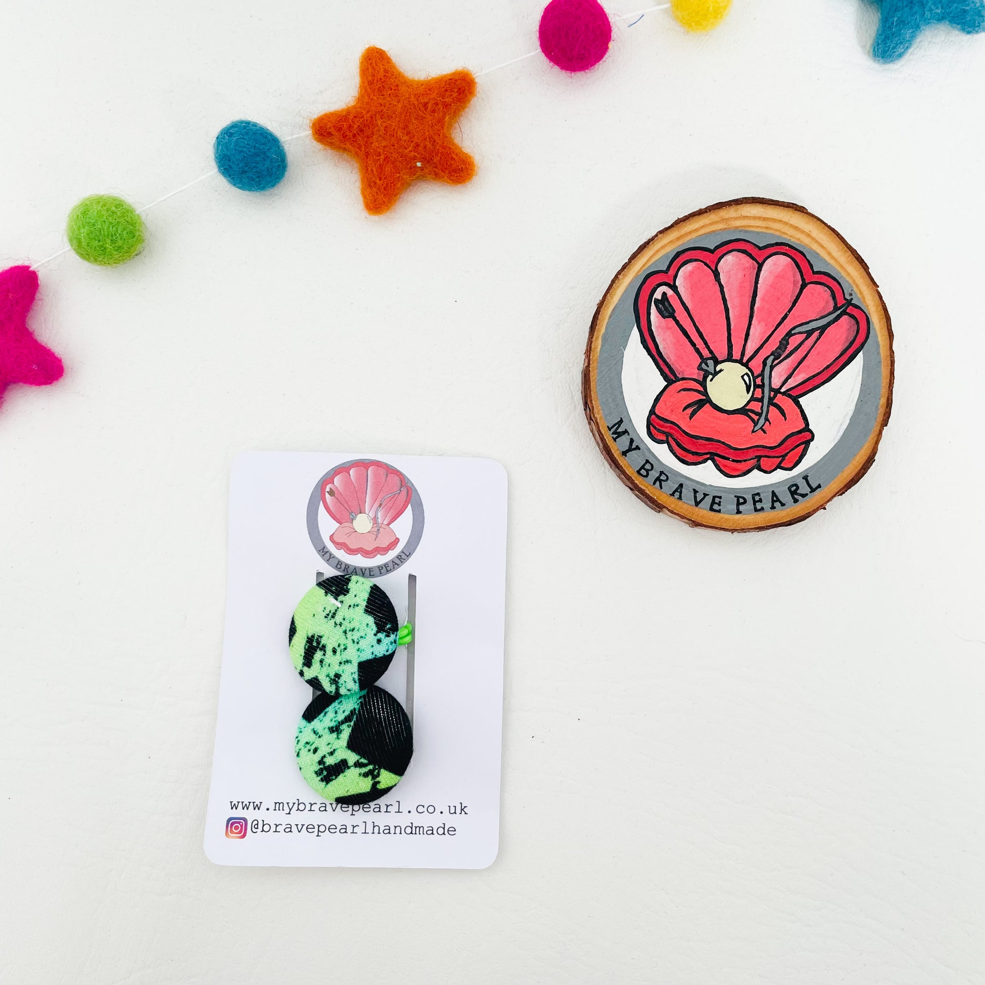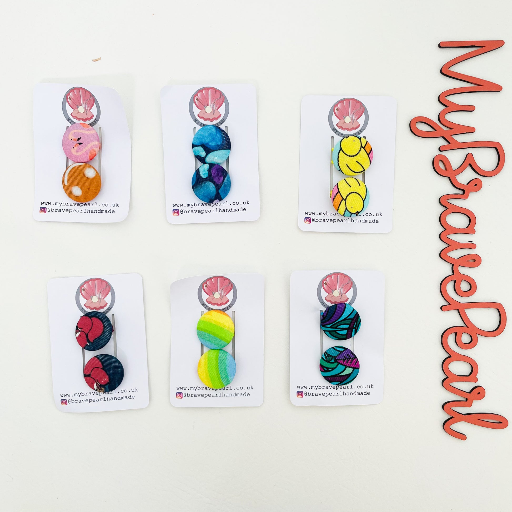 Our 3cm bobbles are made from soft and stretchy cotton Lycra or French terry offcuts with metal backers and a coloured hair tie.