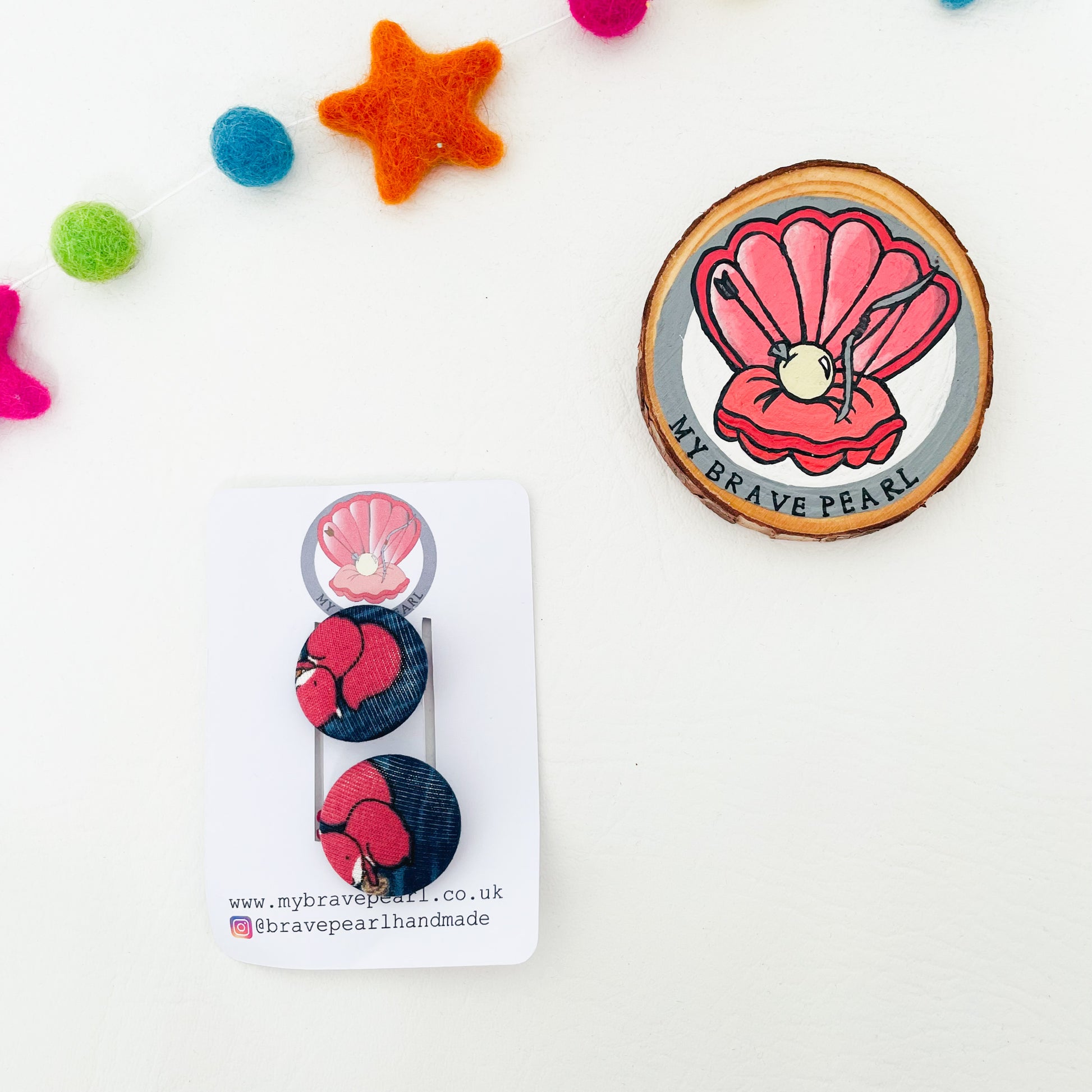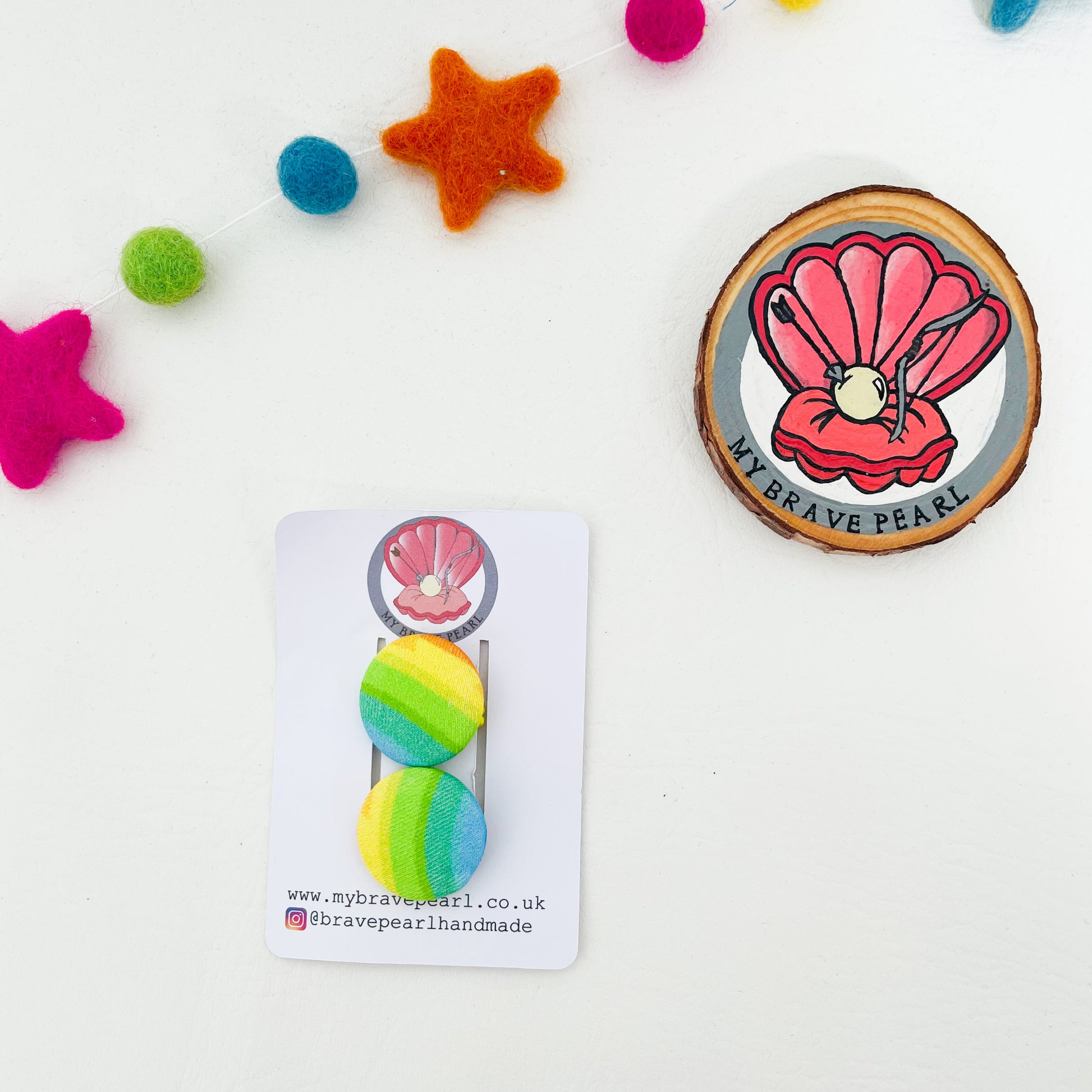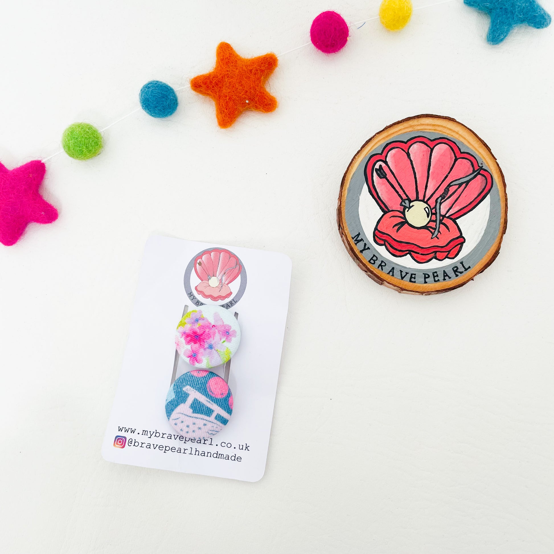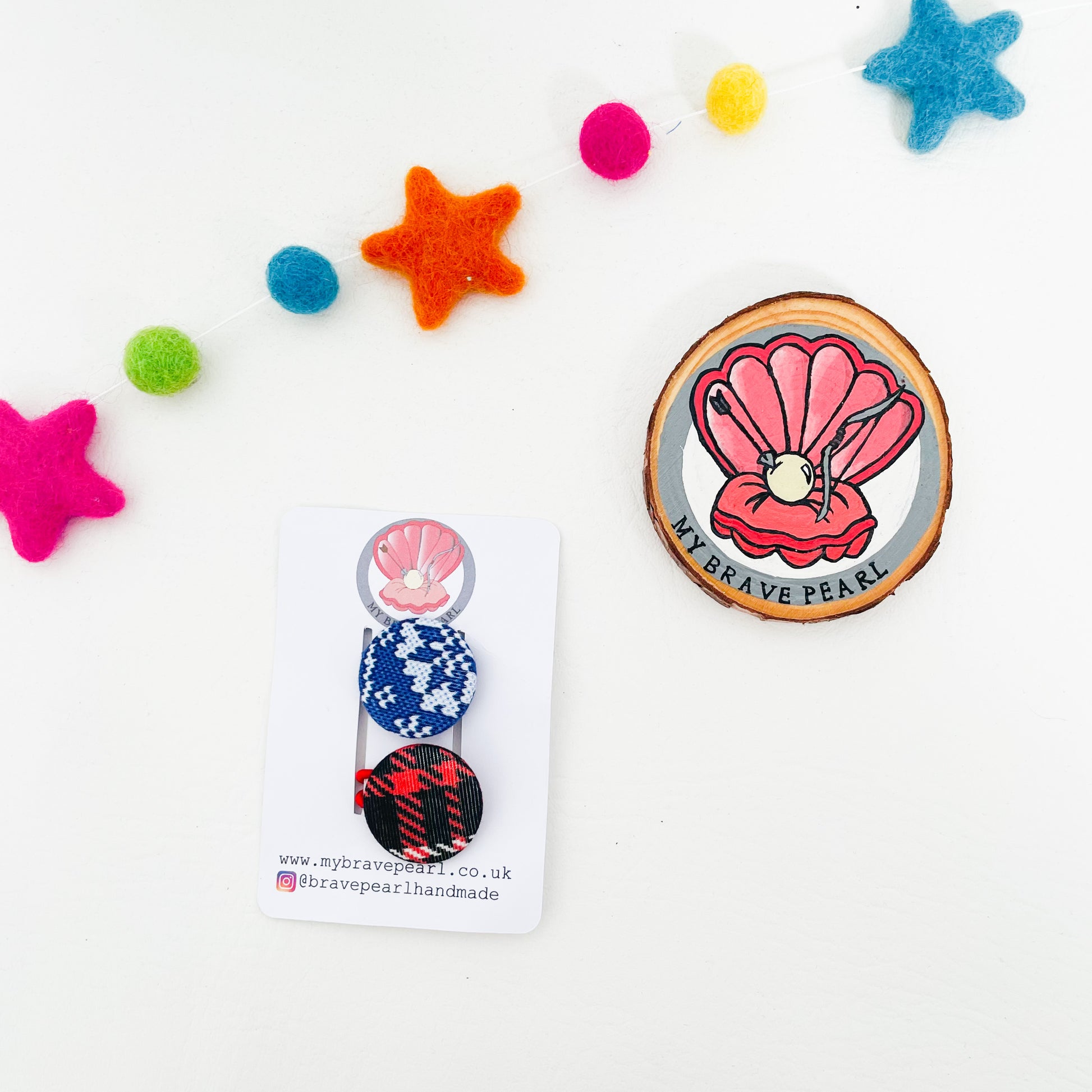 Our 3cm bobbles are made from soft and stretchy cotton Lycra or French terry offcuts with metal backers and a coloured hair tie.