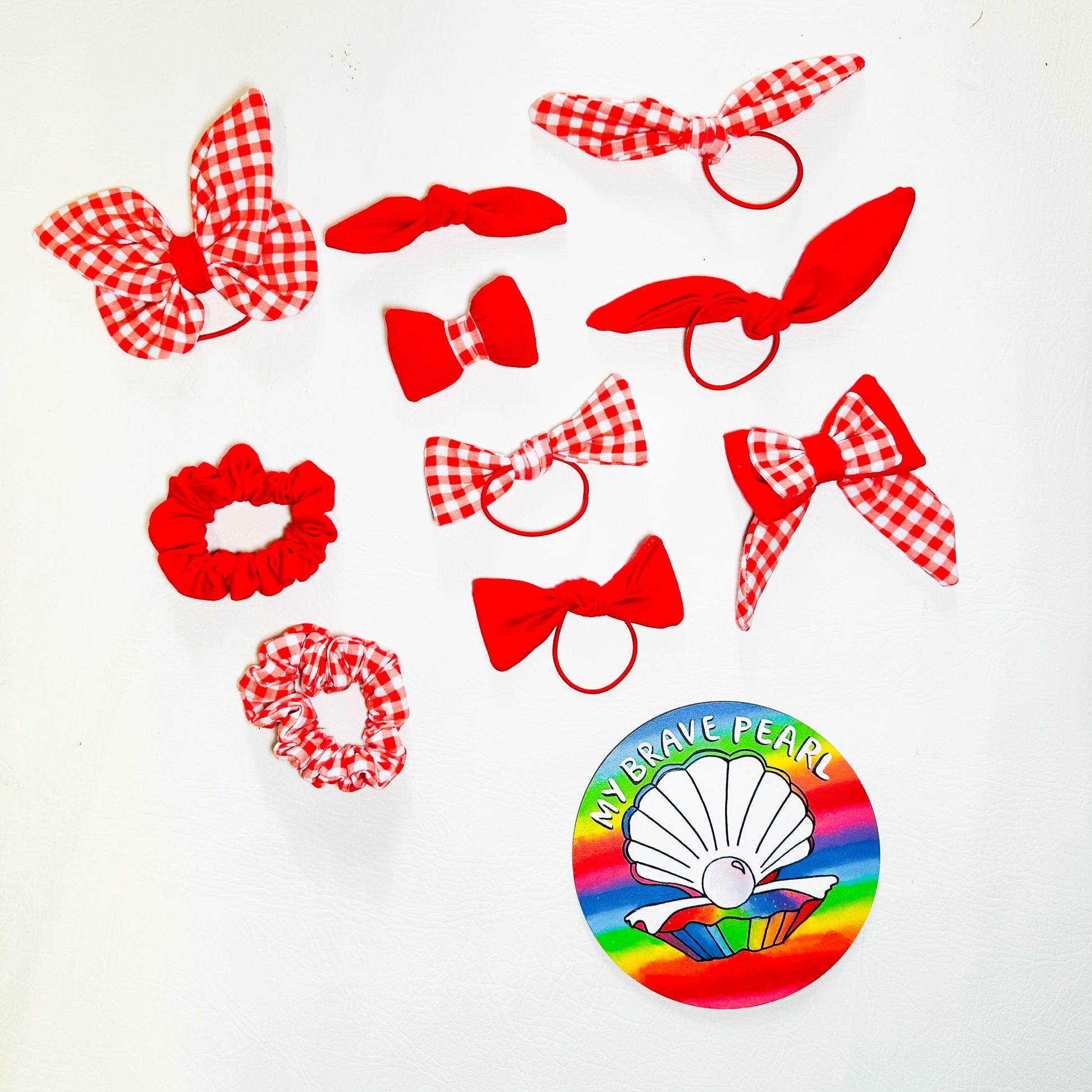 The 10 piece bundle will be a mix of any of the pictured items, both bobbles and clips, excluding the super scrunchie. There may also be some surprise hair accessories! If gingham is chosen, the bundle will feature matching plains as well.