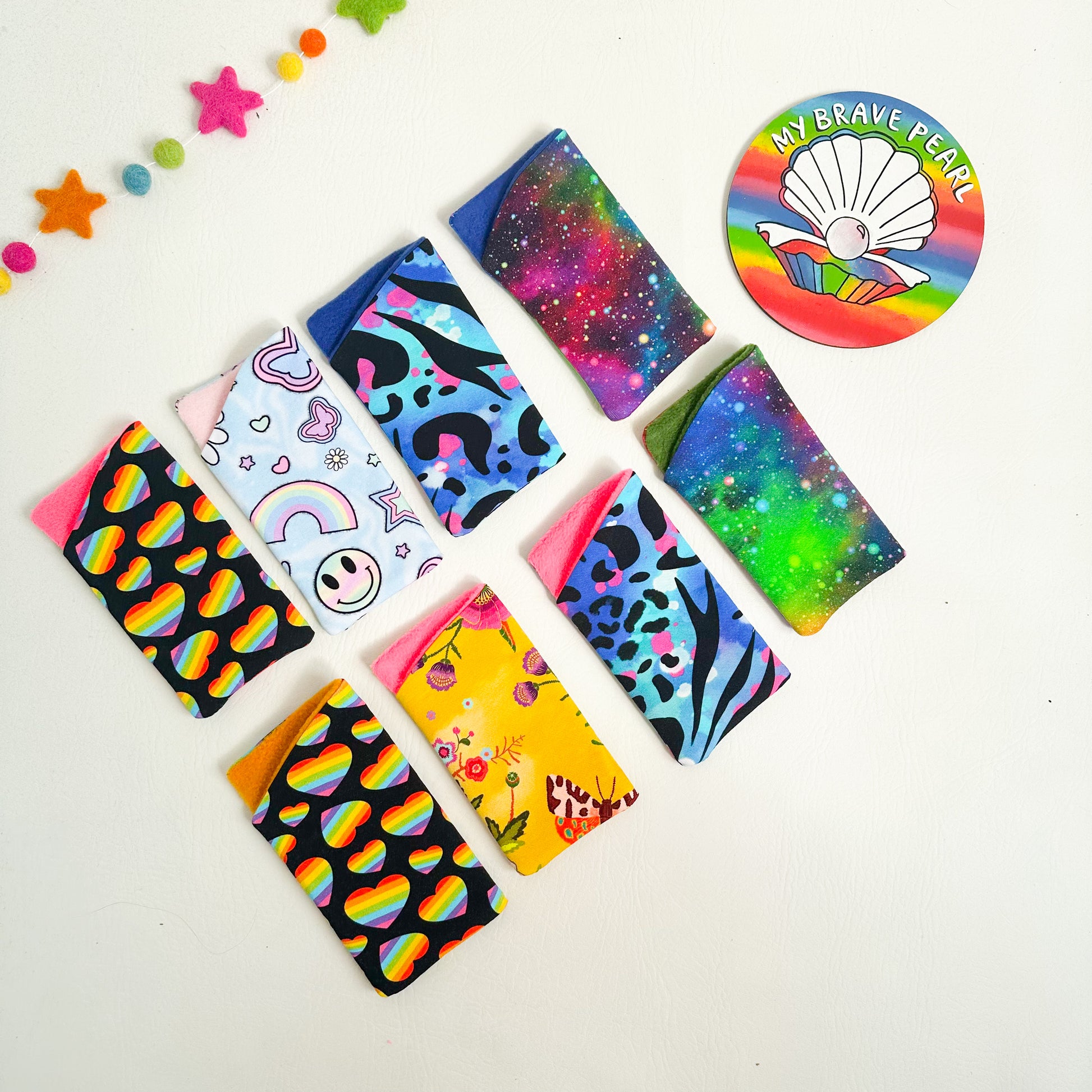 Our little sunglasses pouches are made from soft cotton Lycra jersey and polar fleece! And as they are made from sone of smaller scraps they are helping me keep this little shop eco!